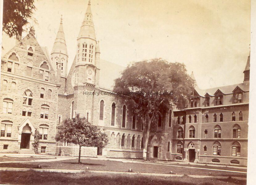 Courtyard of L-shaped building complex. May include a chapel. Slides from Farwell-Winston family photograph album, 1887-1901.