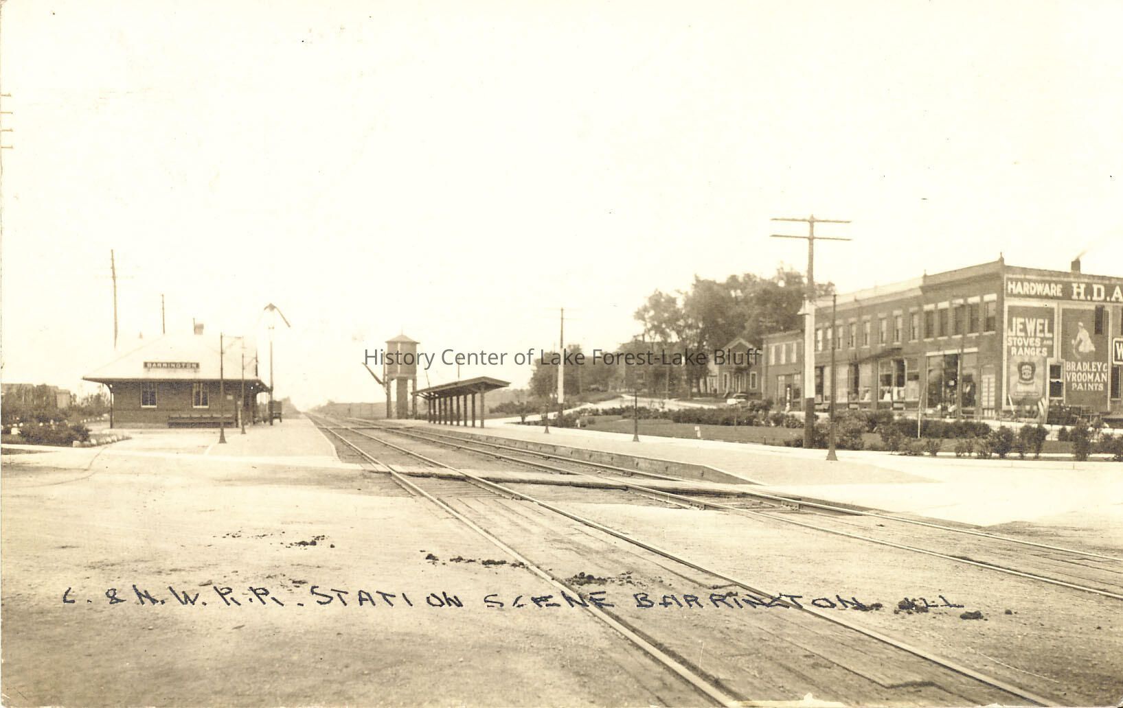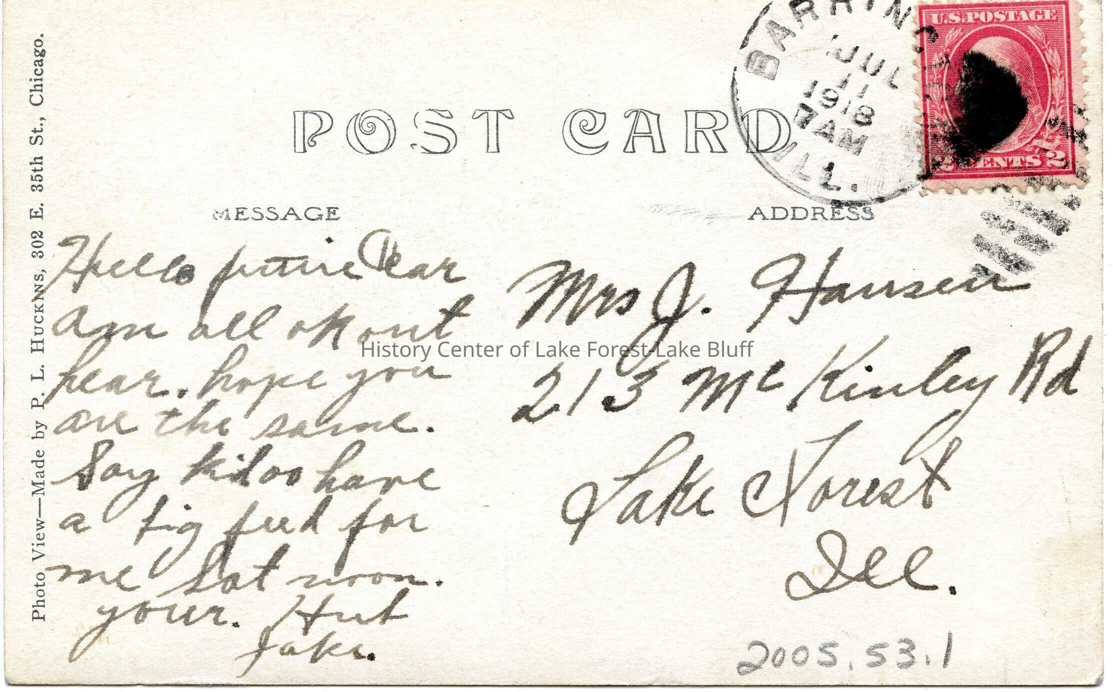 post card with a picture of the C. & N.W. R.R. Station Scene Barrington, IL. On the back there is a message from Jake to his wife. Mailed from Barrington to Lake Forest.