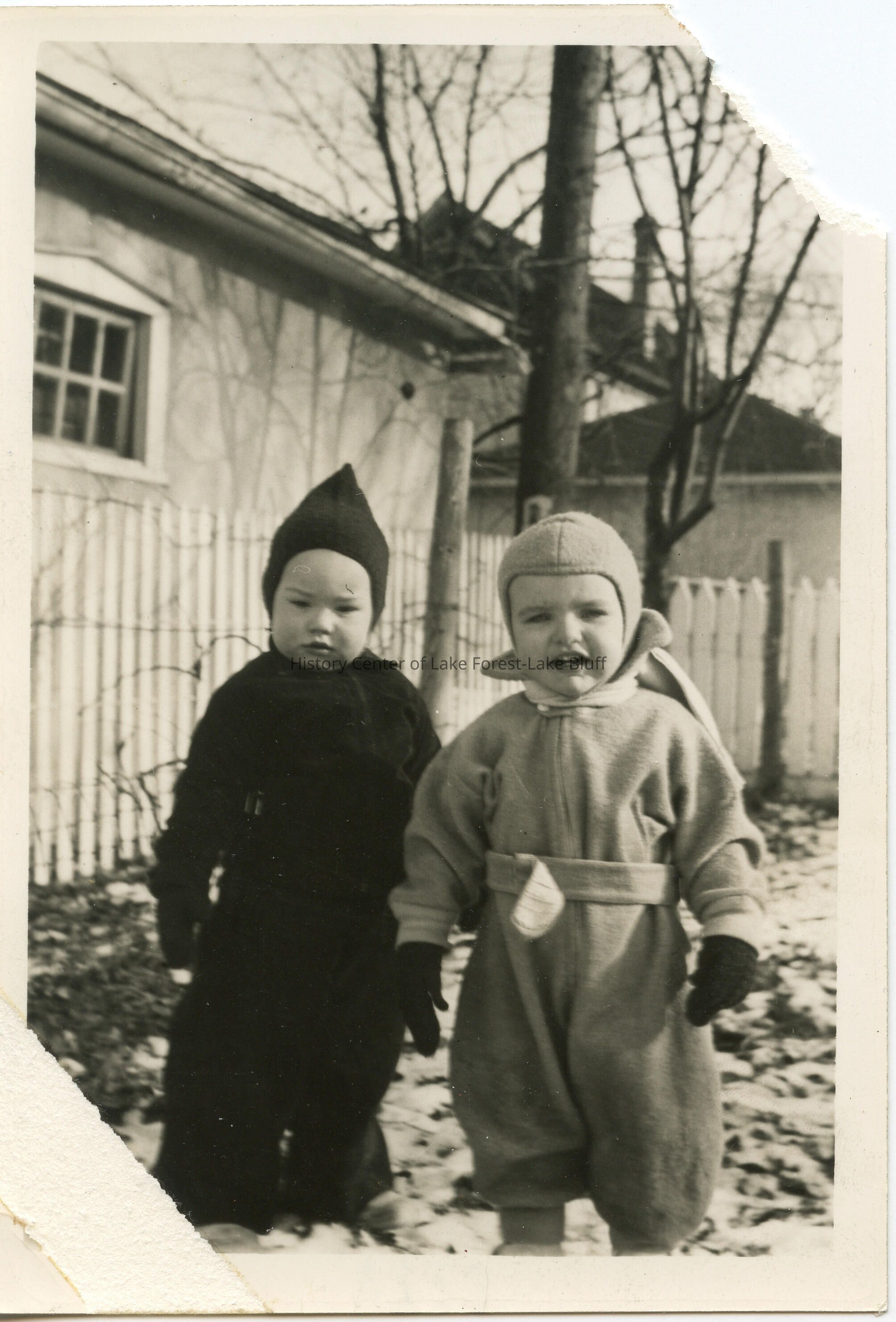 Two children bundled up in winter clothes to play outside in the snow. Child on right is David O'Neill. Circa 1940s.