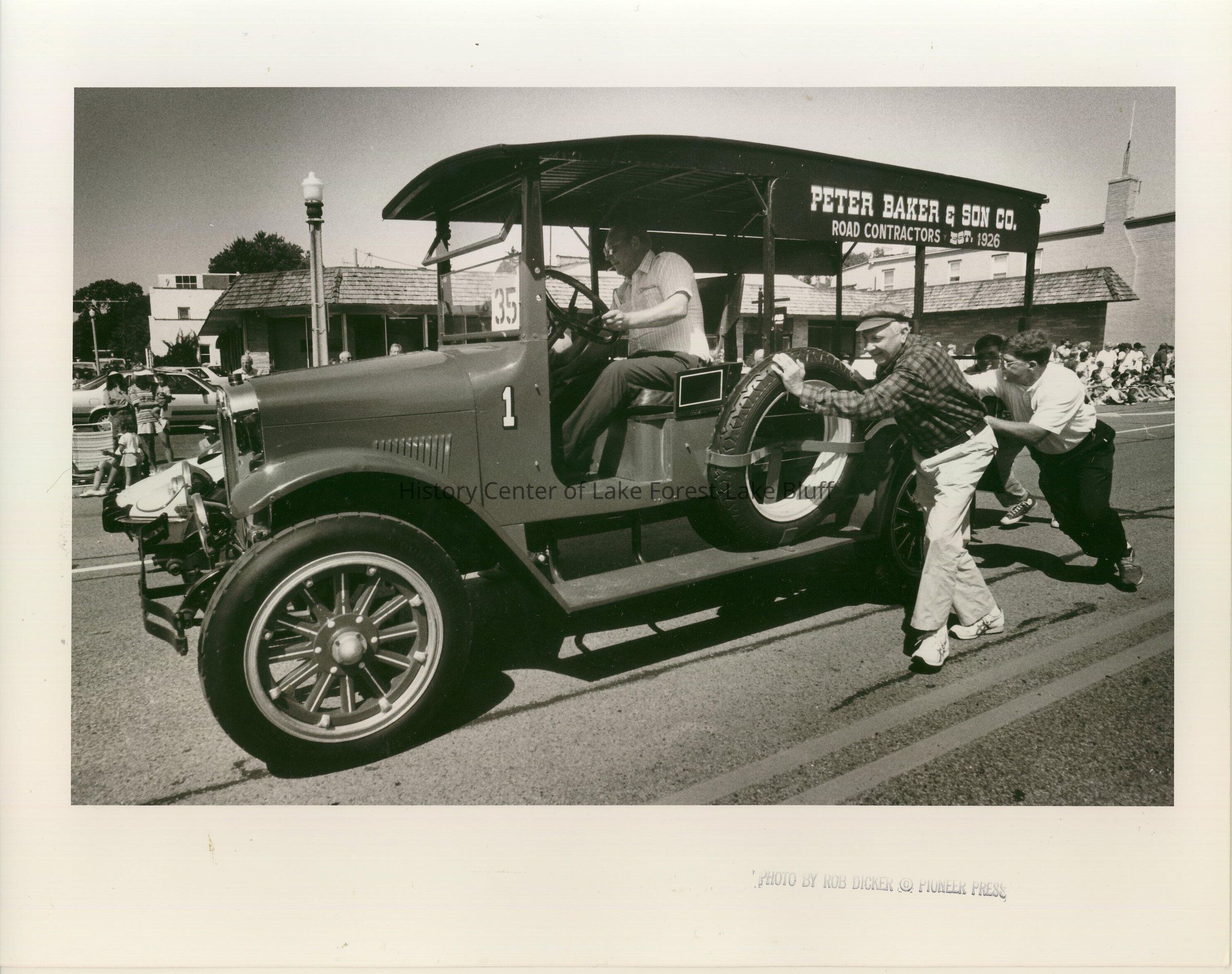 The Peter Baker & Son Co. vehicle gets a push after conking out on the parade route in 1992.