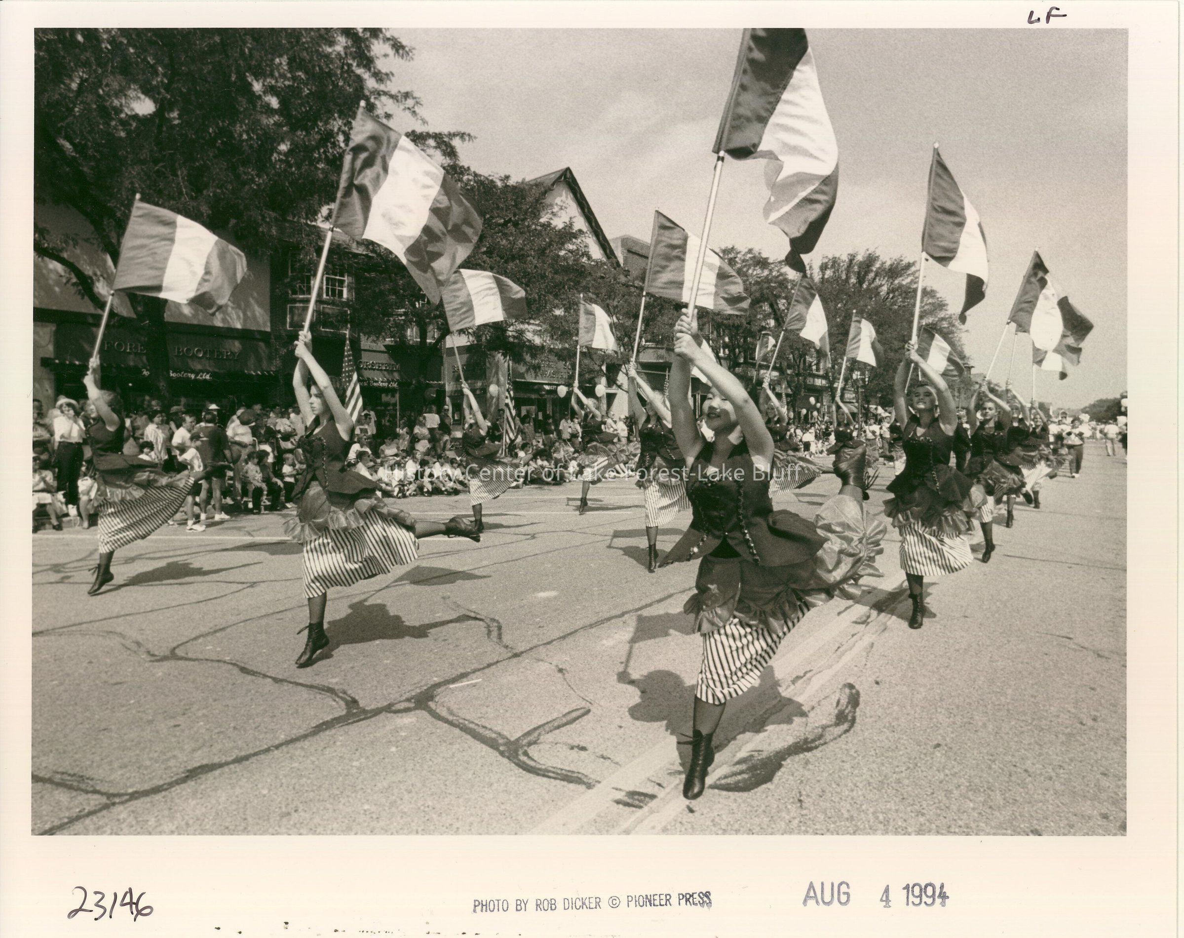 Flag twirlers from the Seattle Cascades Drum and Bugle Corp. march in the parade, passing by Lake Forest Bootery August 4, 1991