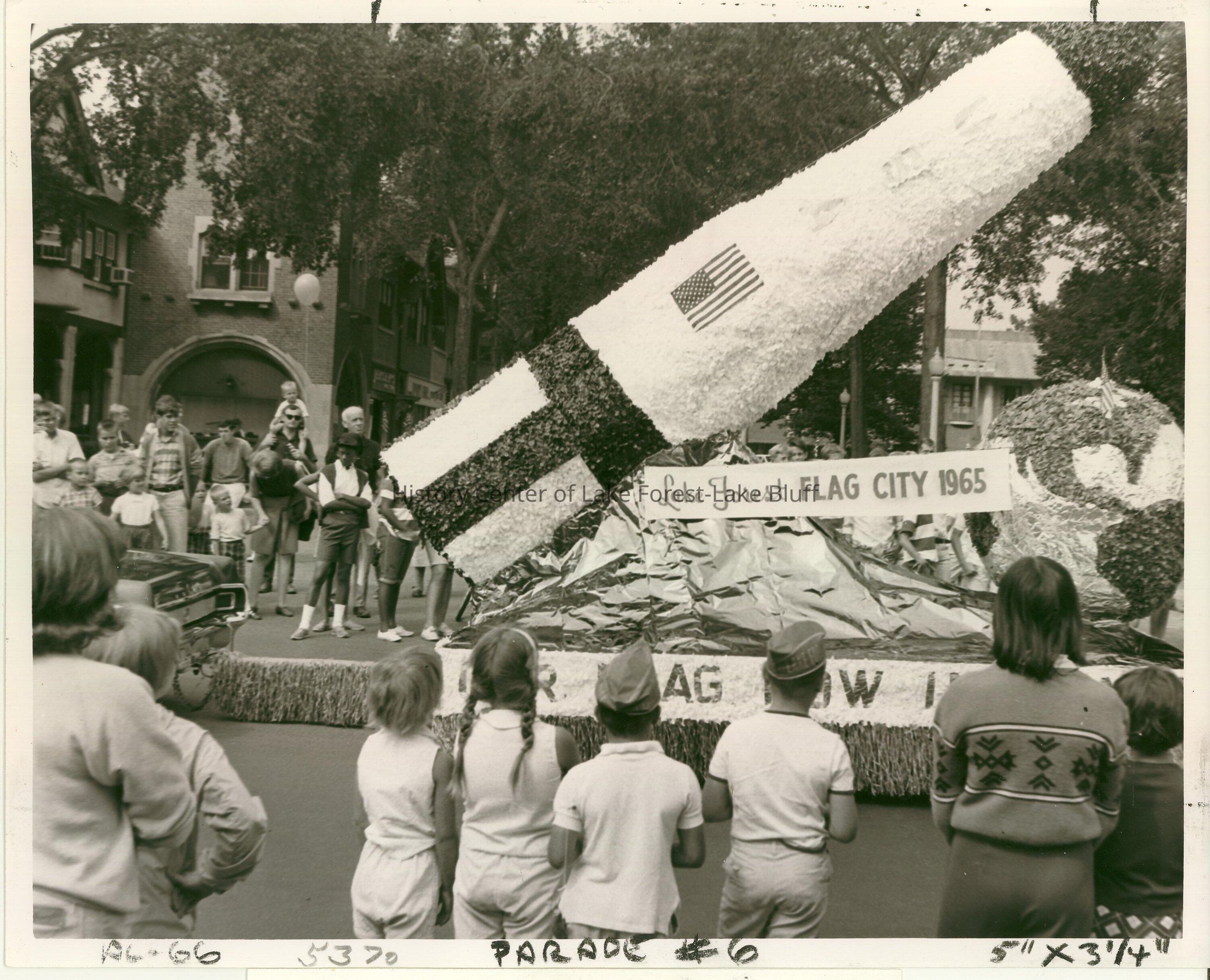 A float with a space ship and a sign reading "Lake Forest Flag City 1965" on it passes by Market Square