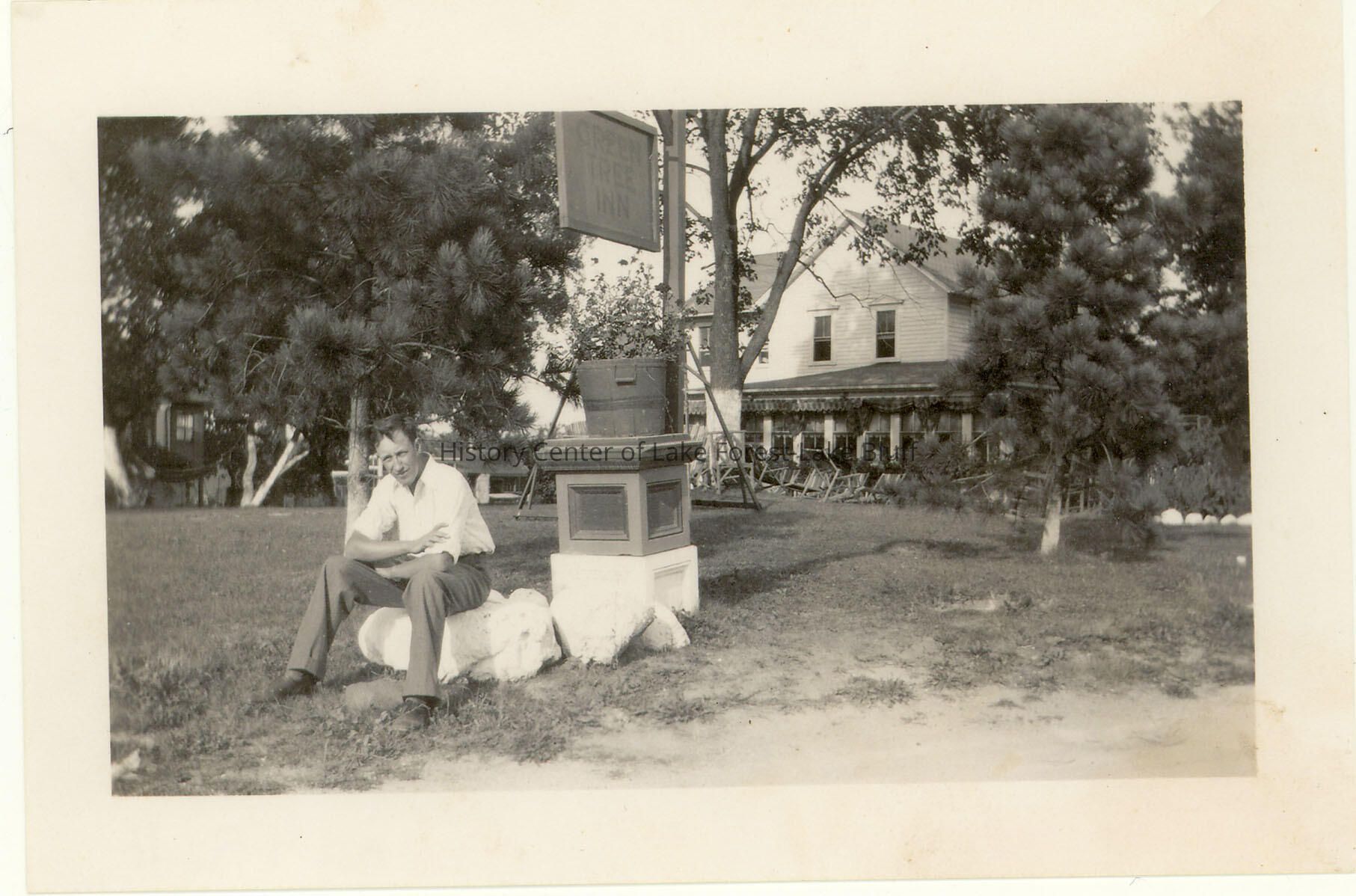 photo of a man sitting on a rock near the road. A sign behind him says "Green Tree Inn".
