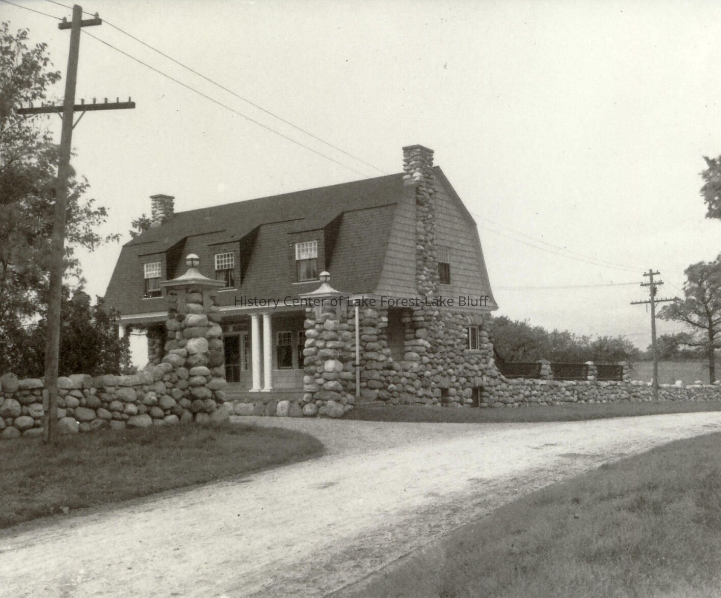 Gate house on the Westleigh estate. The gate house has a gambrel roof with dormer windows and features stone chimneys and gates.