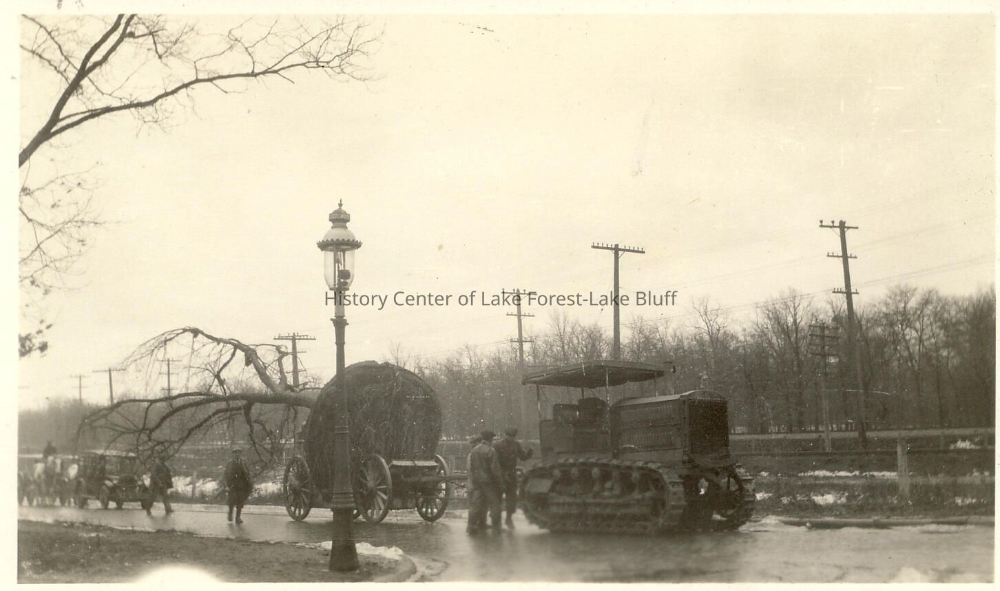 A tractor pulling a large tree on a cart down an unidentified road. It looks like it is next to railroad tracks. Tree may be from Westleigh or Lancaster Farm