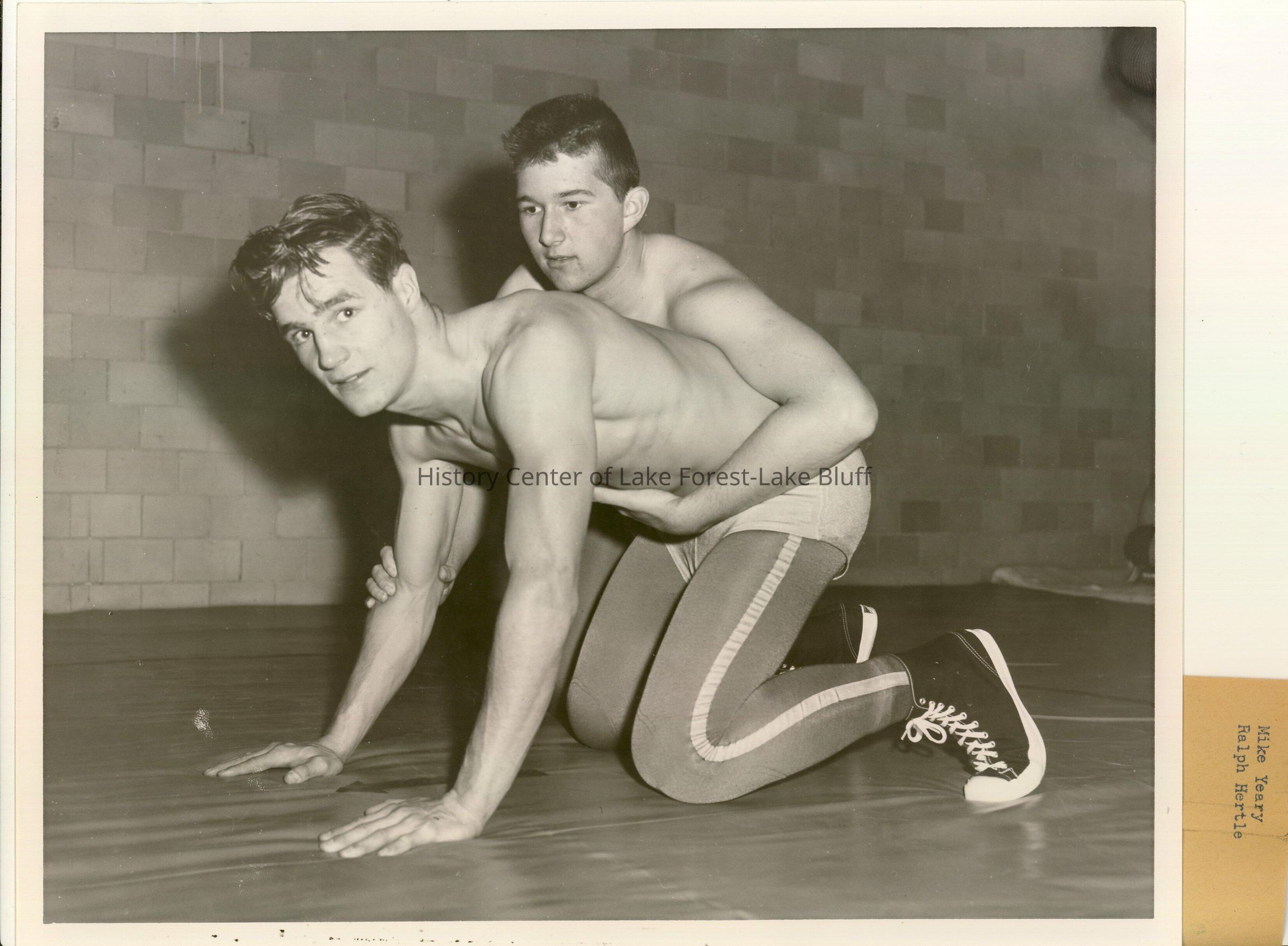 Wrestlers Mike Yeary and Ralph Hertle pose for a photo stamped on back: "Photo By Dick Phillips 585 W. Deerpath Lake Forest, ILL."