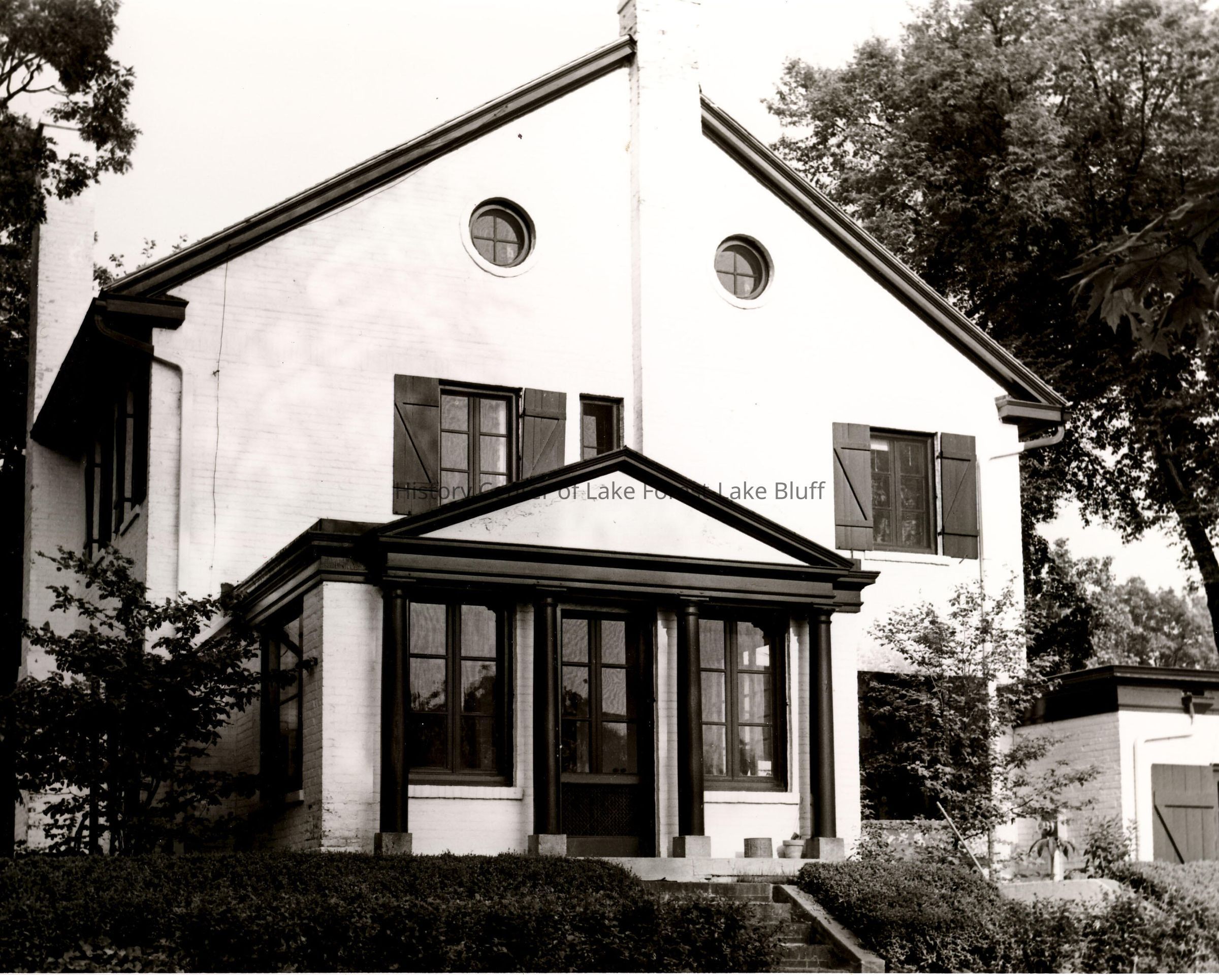 Black and white horizontal gloss photograph of caddy shack for Mill Road Farm Golf Course 1036 Estate Lane Mill Road Farm (Lasker Estate) Albert D. Lasker and Flora Warner Lasker architect -David Adler landscape architects- Louise S. Hubbard and James L. Greenleaf