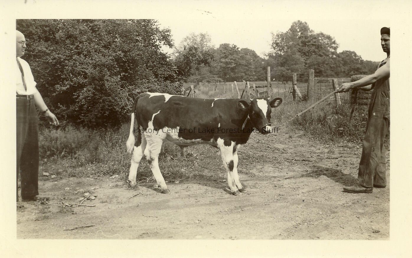 Two unidentified men and calf in center at Old Mill Farm