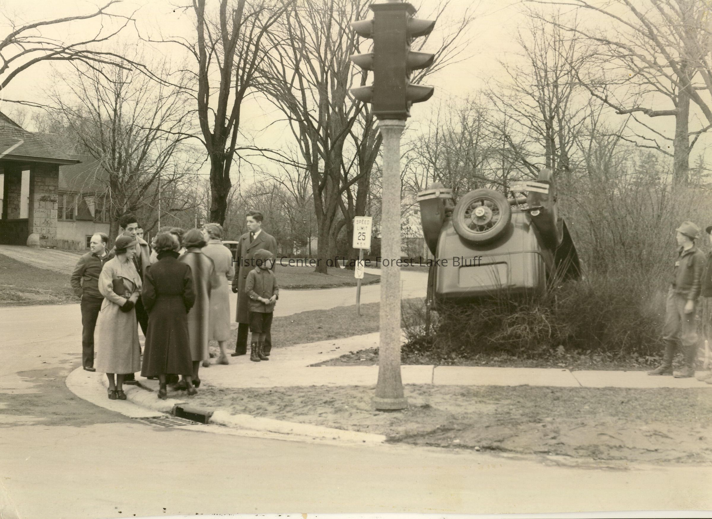 Car flipped over at the northeast corner of Deerpath and Sheridan. View is looking toward First Presbyterian Church and Bell School. Intersection has a traffic light (which was there into the 1980s). A number of people are gathered at the corner.