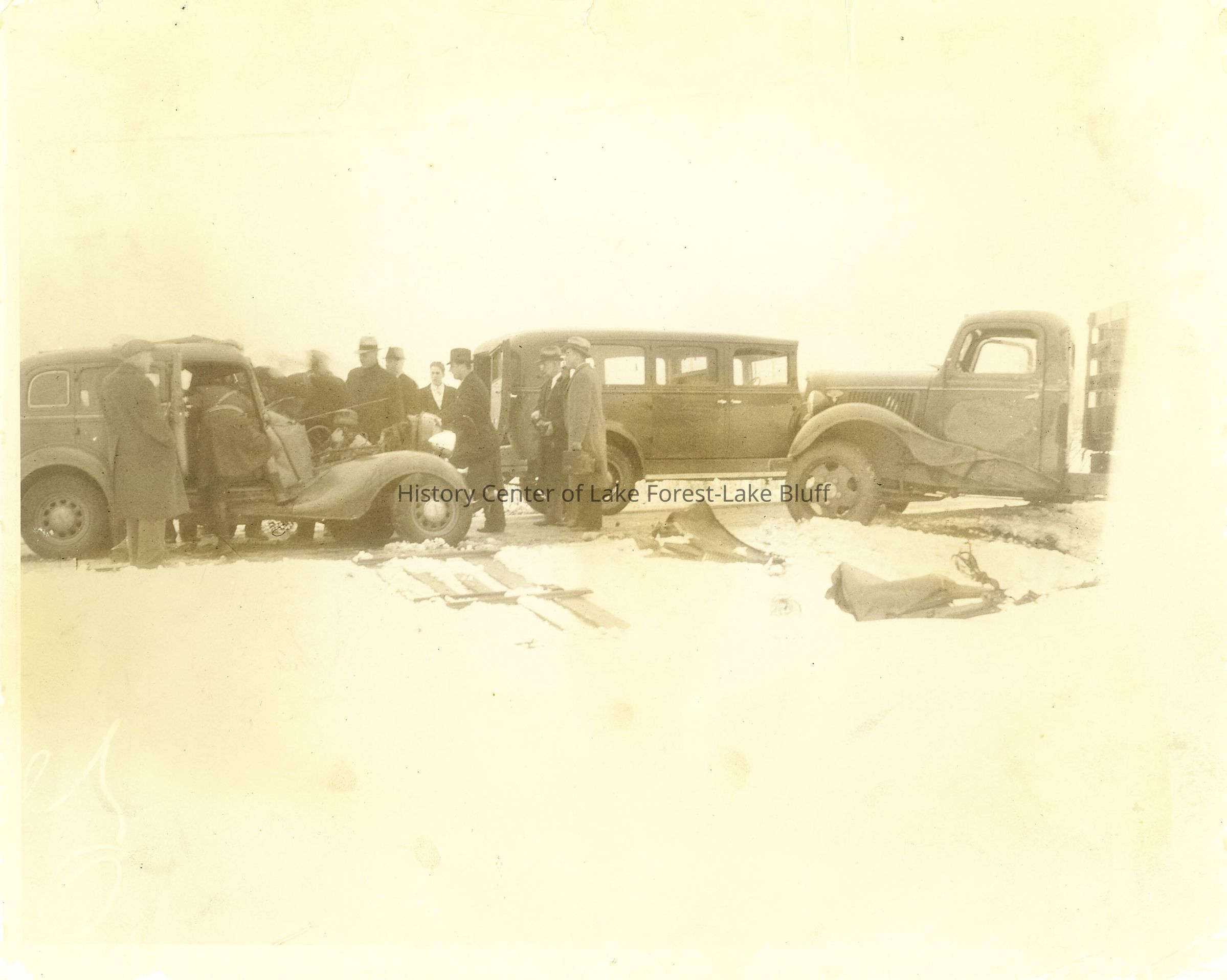 Undated image of a car accident at an unidentified location. Three trucks are visible, and a number of men are gathered at the scene. There is snow on the ground. A police officer appears to be stepping into the front seat of one of the crashed vehicles.