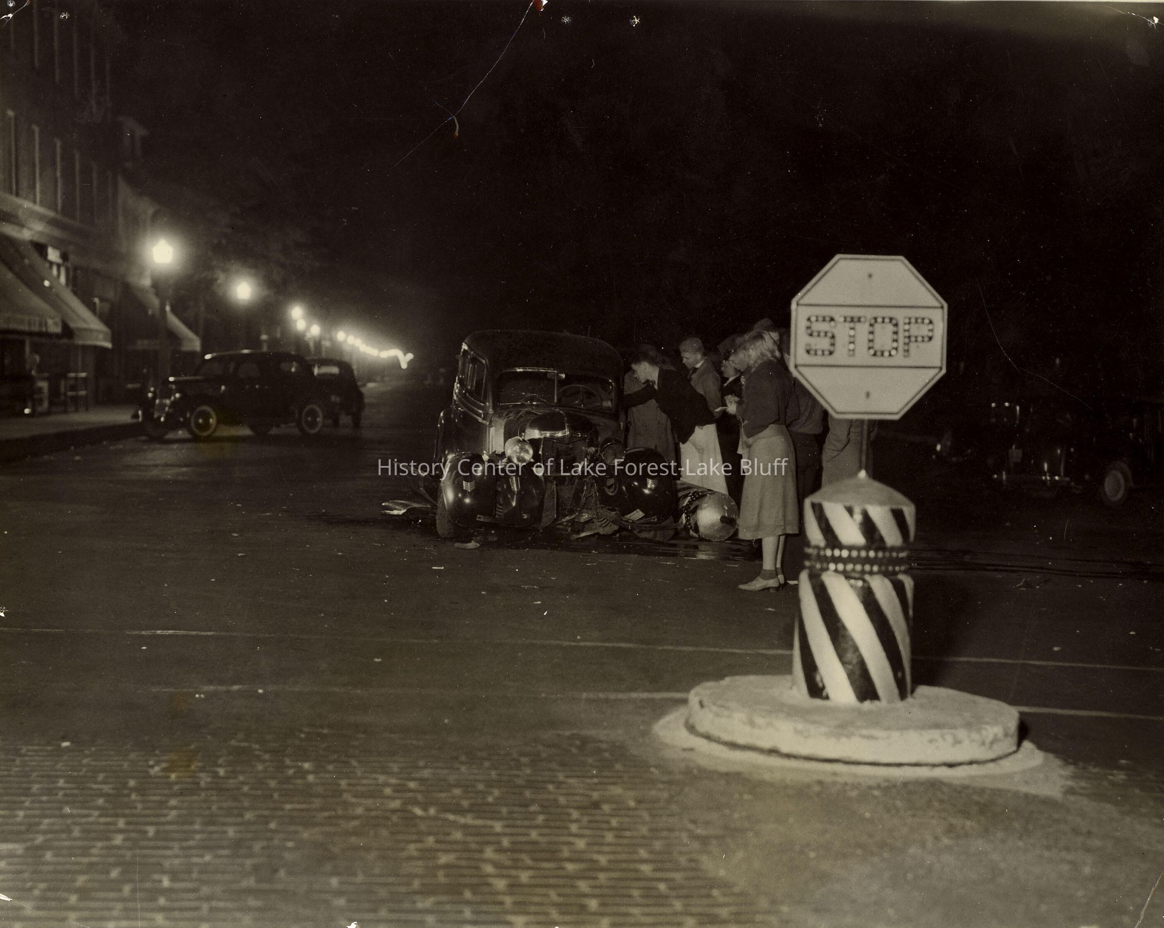 View looking north on Western Avenue at the intersection of Western and Deerpath, downtown Lake Forest. Totaled car, with a number of onlookers, men and women, observing. Prominent view of stop sign.