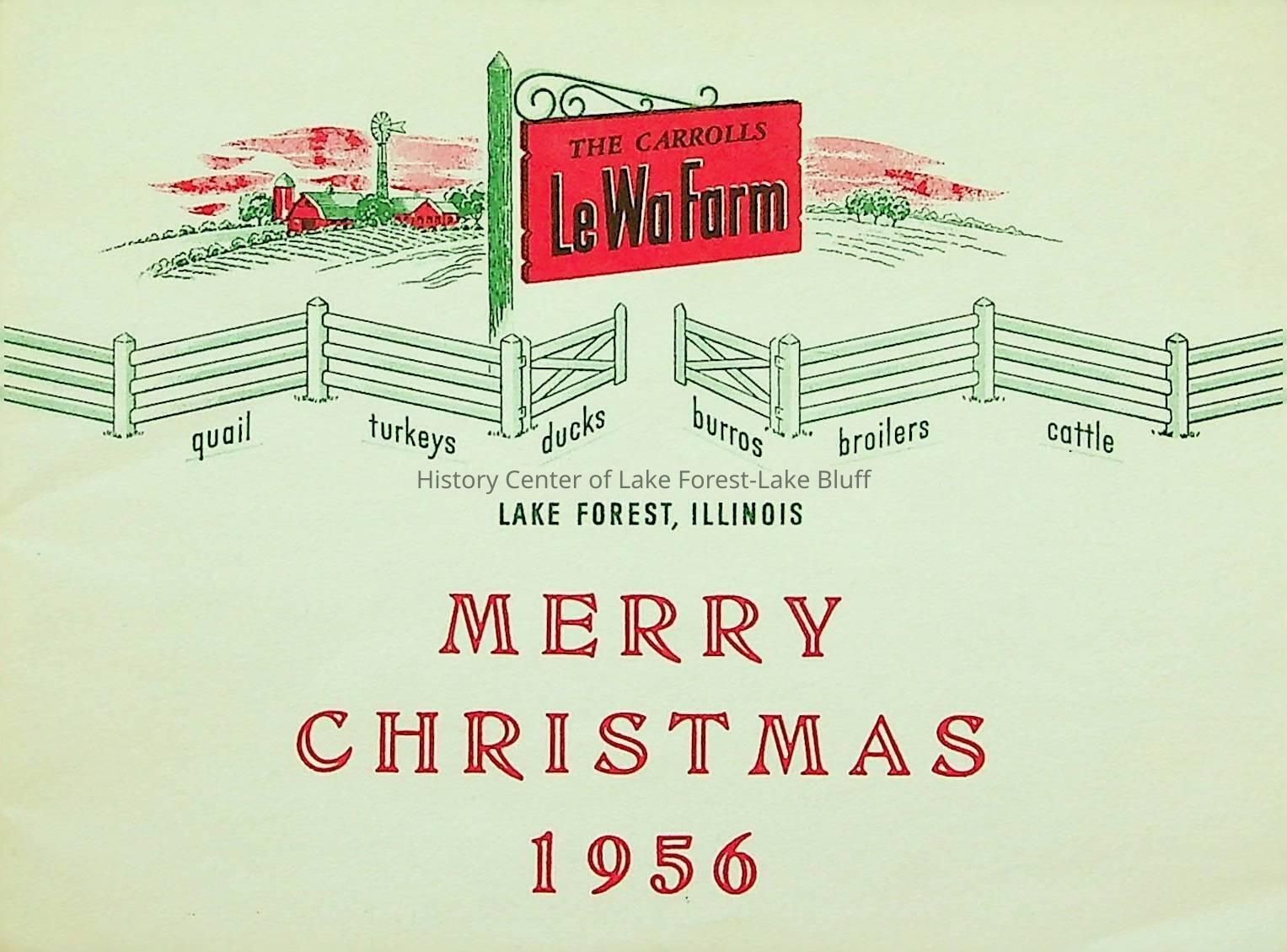 Stiff paper folded into fourths. The cover of the card features a farm and a sign which reads :LeWa Farms", the family home of the Carrolls. Besides on the cover, the card does not contain any writing. Black and white photo is printed onto the paper.