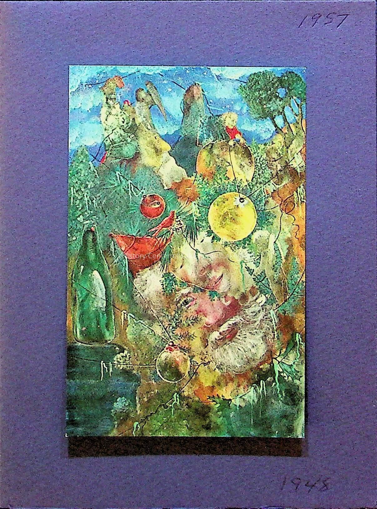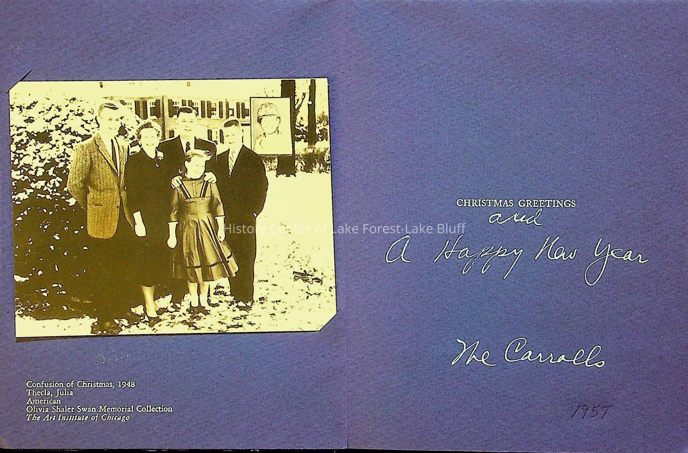 Blue cardboard paper folded into fourths. The cover of the card featues a glossy cutout image of a chirstmas themed painting. Inside the card, there is a handwritten message to the addressee opposite a black and white photo which is held in place by two slits in the cardboard paper.