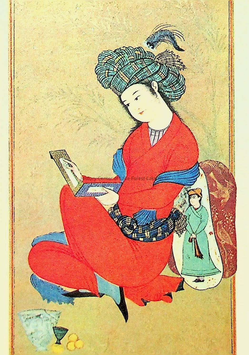 Front image is a printed version of a 17th century Persian miniature. The inside of the card contains a handwirtten message to the addressee above a black and white photo which is held in place by four slits in the card stock.