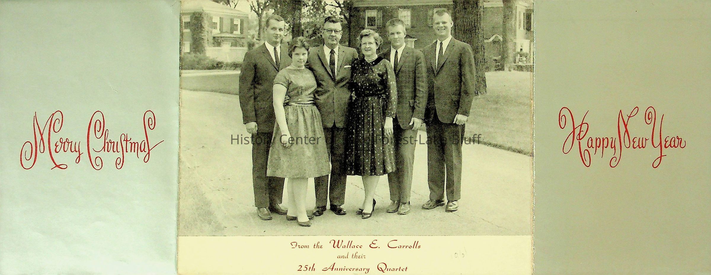 Metallic silver cardstock paper folded in half lengthwise and then folded to make two opening flaps. Front of the card features a stamped image of brick posts and gates. Card opens to show printed black and white photograph which is bordered by text which reads "Merry Christmas" and "Happy New Years", respectively. Beneath the photo a caption references the family's 25th Anniversary.