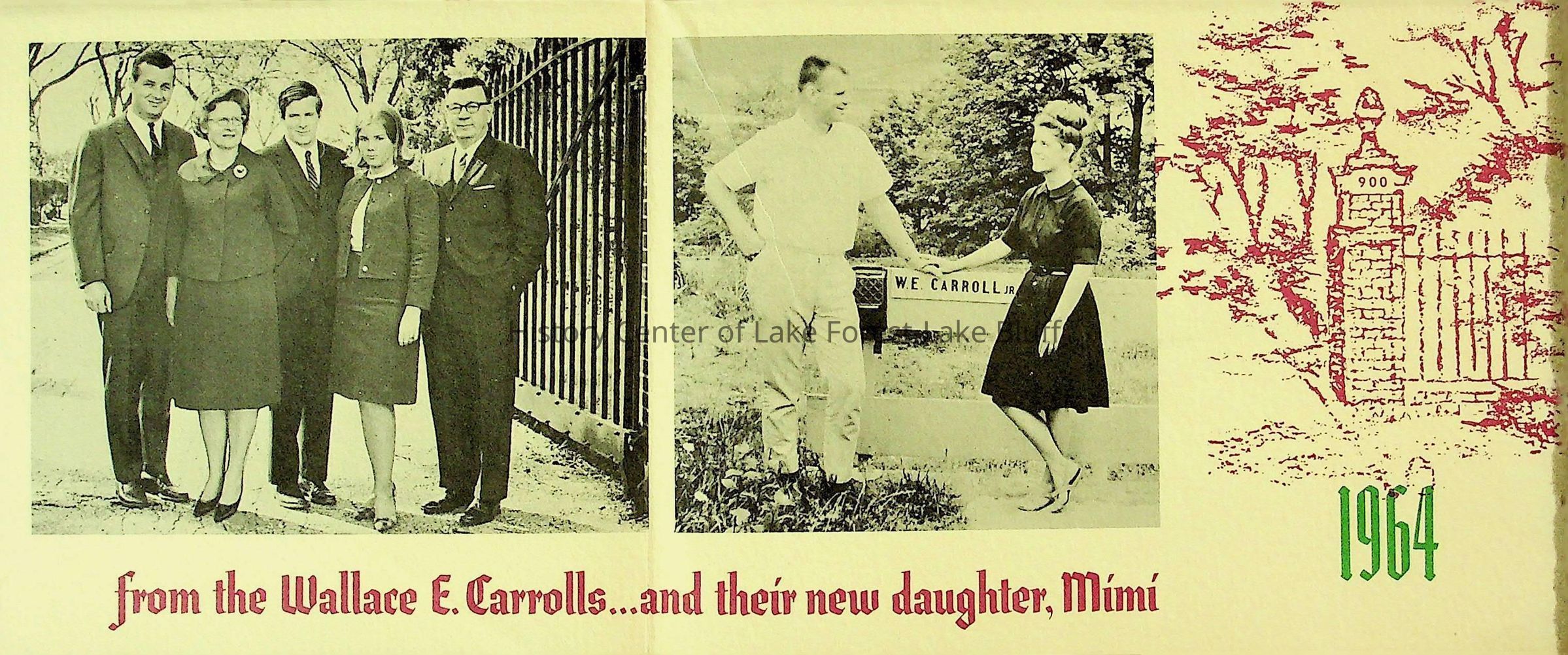 Off-white cardstock paper folded three-fourths of the way over itself, with stamped image of brick posts and gates covering the top fold and continuing on to the revelaed lower fold.. Card opens to show two printed black and white photographs with part of the stamped image serving as a background. This is the first card which features Patrick Carroll's wife, Mimi.