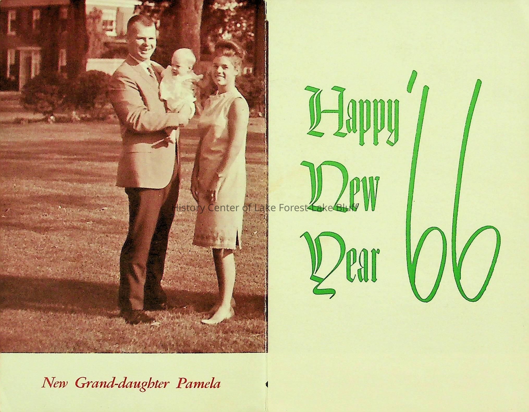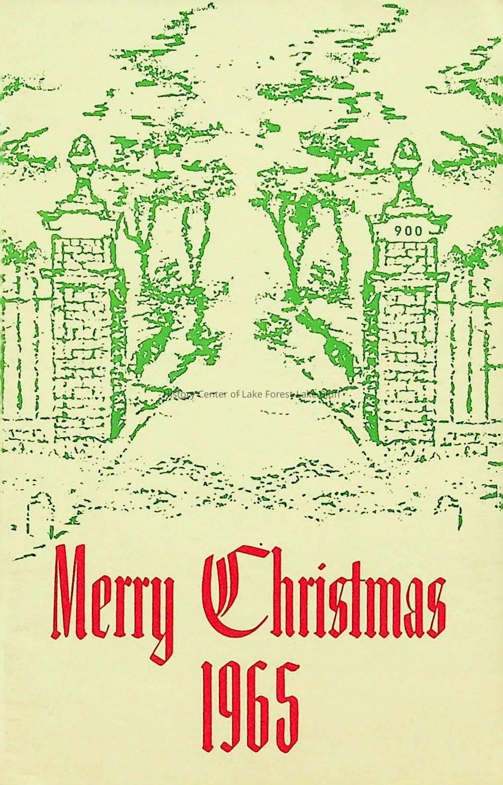 Cardstock folded three times. The front of the card features the stamped imgage of brick posts and attached gates, When the card is opened one-third of the way, it reaveals a New Years greeting and when all folds are opened, it reveals a printed photograph. First time that Barry Carroll's wife, Barbara, is featured.