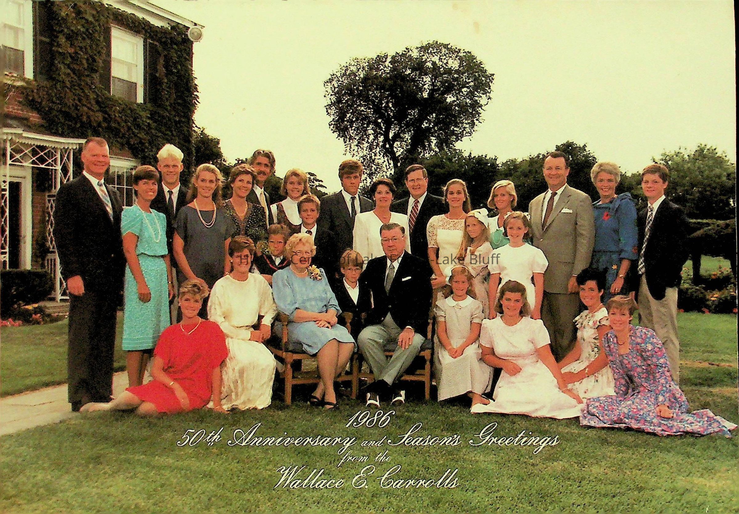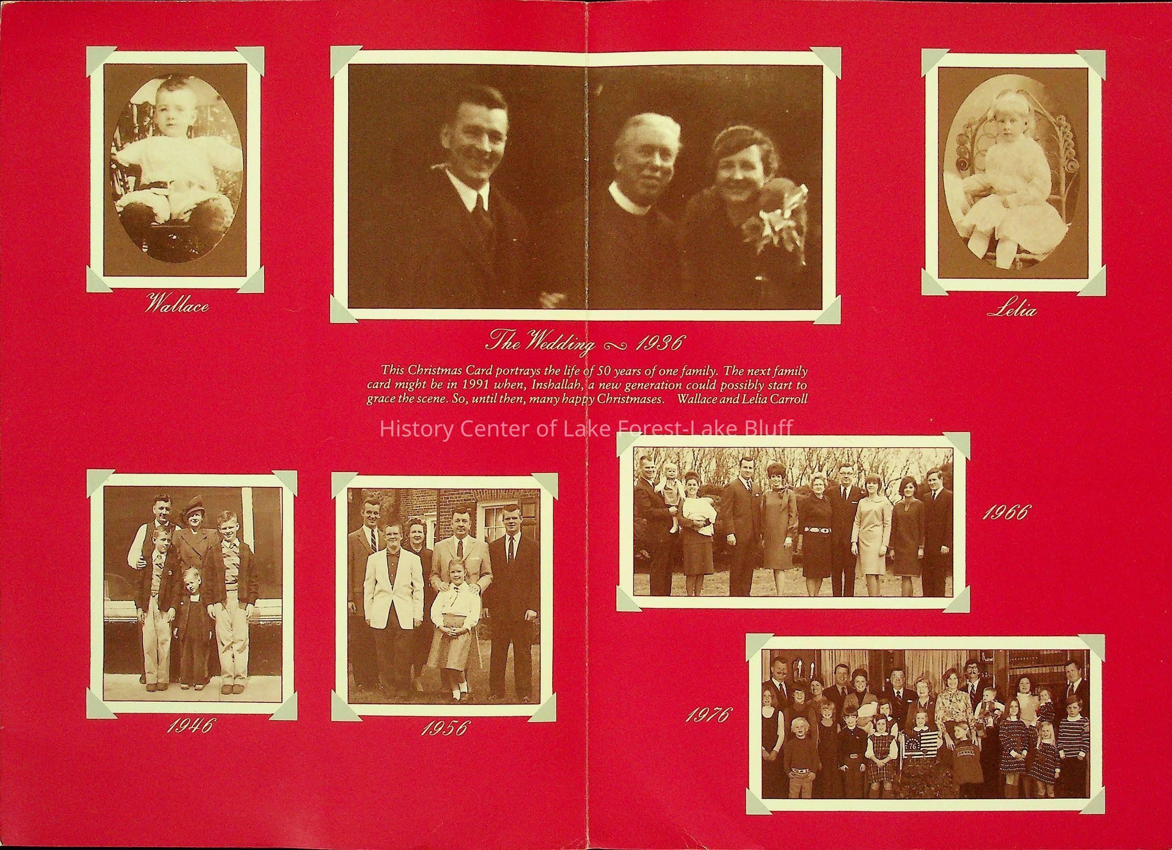 Glossy cardstock. The cover of the card fetures a large printed color photograph of the entire Carroll family. When opened, the card features a printed psuedo-scrapbook collection of photos from the Carroll's past, from 1936- 1976 and baby pictures of Wallace and Lelia. The back of the card is a pritned color photgraph of all 18 of the Carroll grandchildren