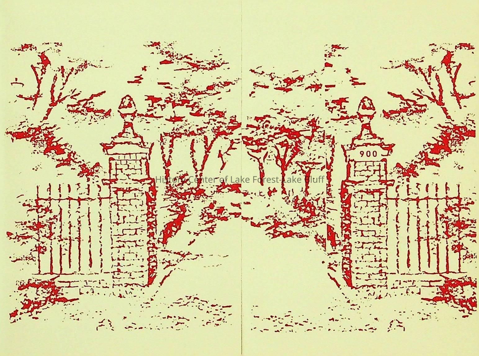 White cardstock paper folded in half lengthwise and then folded to make two opening flaps. Front of the card features a stamped image of brick posts and gates.