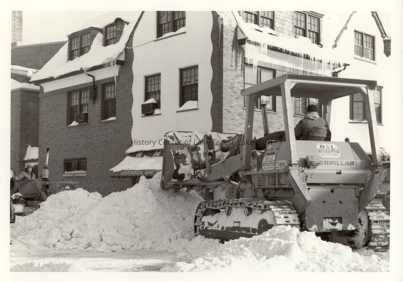 Caterpillar snow plow at the corner of Bank Lane and Deerpath. Taken after the blizzard of January, 1979. The business, Continental-Hart Shaw and Company (Real Estate) at 260 East Deerpath can be seen.