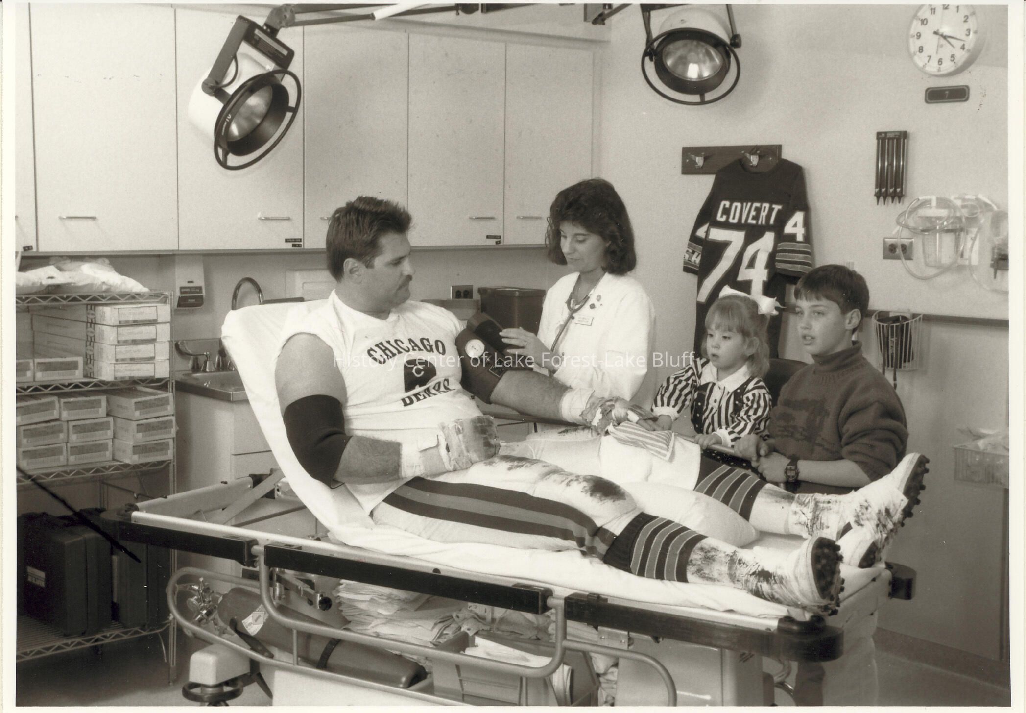 Chicago Bears offensive tackle, Jim Covert is attended by Cathy Orr, R. N., as his daughter, Jessica, and son, Casey, look on. Covert is appearing in a special poster for nurse recruitment through the Illinois Hospital Association's, "Nurses: Who Cares?" program. His jersey, number 74, hangs on the wall. Photographs relating to Lake Forest Hospital collected for the 100th Anniversary of the Hospital by the Development Department.Made/Created