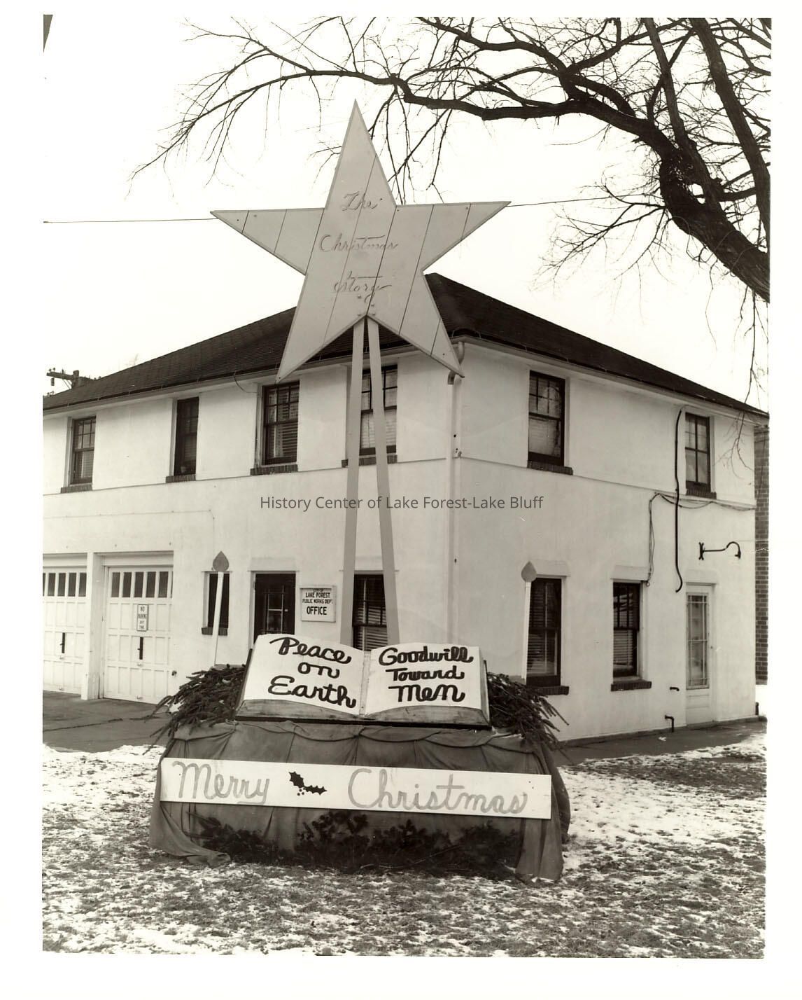 Image of the Lake Forest Public Works Department office. A Christmas display is set up on partially snow-covered ground in front of the building, including a large star that says "A Christmas Story," a book that says "Peace on Earth Goodwill Toward Men," and a banner that says "Merry Christmas."