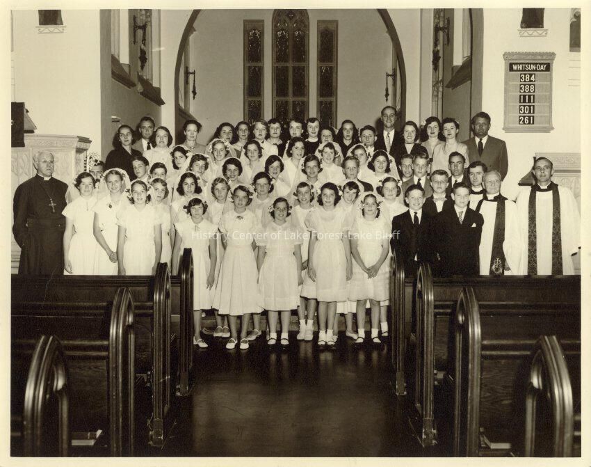 Group photograph inside the Church of the Holy Spirit. Sign with page numbers of hymns reads "Whitsun-day," which is Pentecost. Girls are dressed in white with veils - could be First Communion.