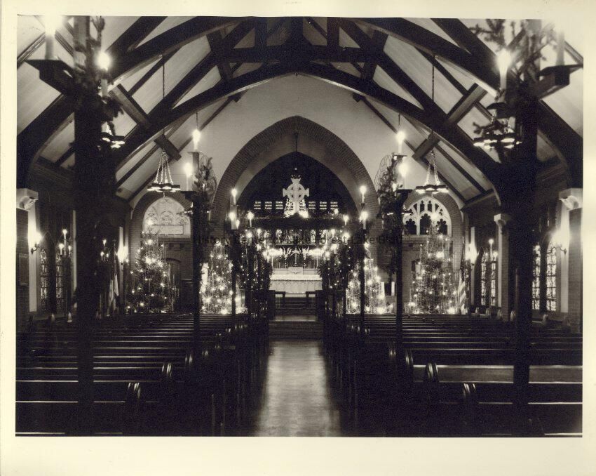 Nave of church with dark beams and Gothic arch at altar, and lighted Christmas trees on both sides of altar Church of the Holy Spirit (Episcopal) at 400 E. Westminster
