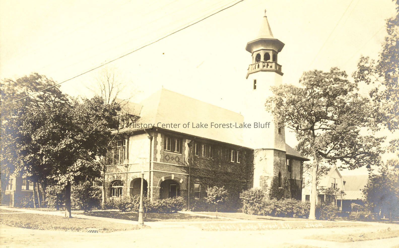 two-story brick and stone structure with tower on side reverse is blank 220 East Deerpath