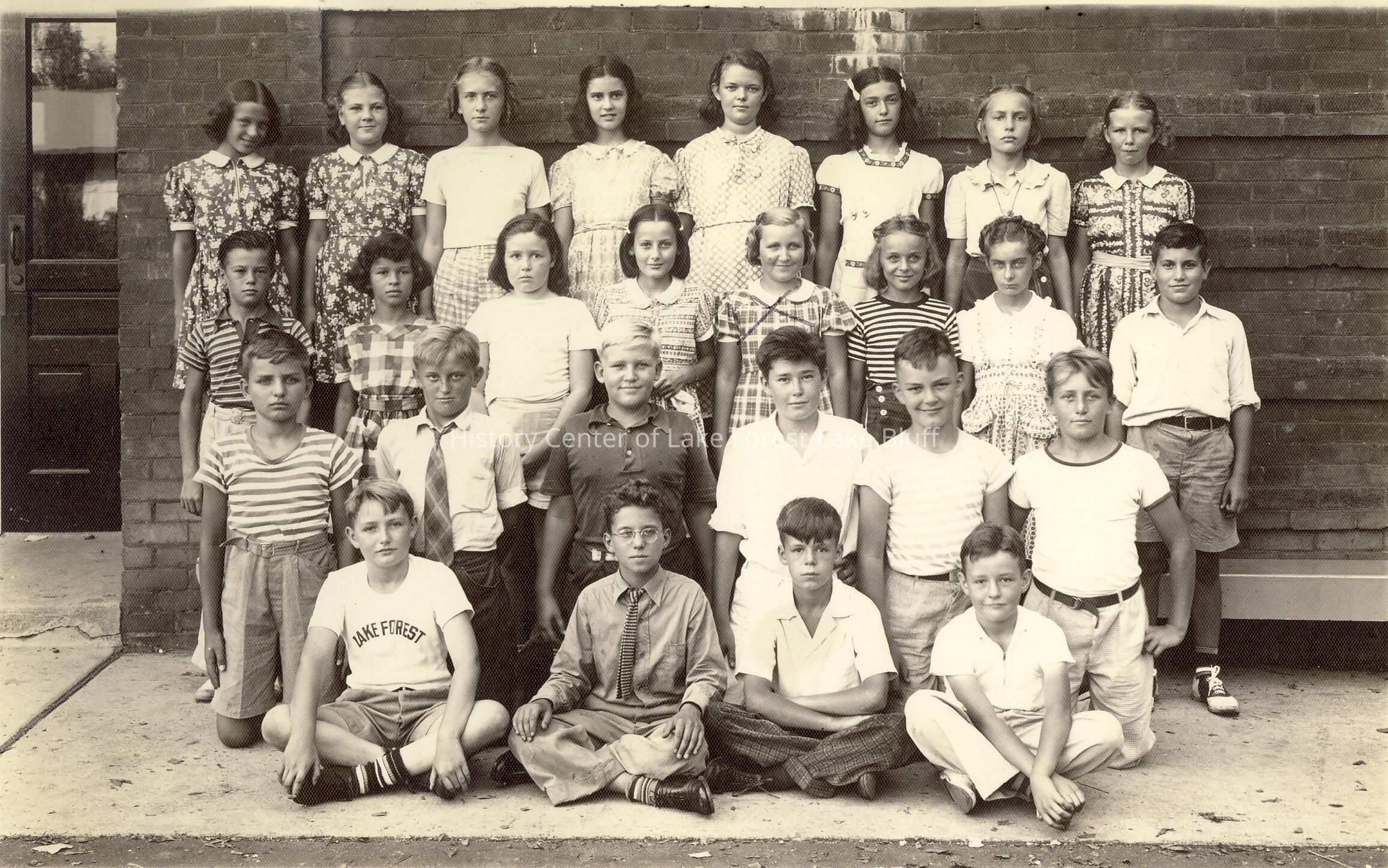 1940-6th grade see also 2002.1.301 girl in plaid dress-3rd row, 5th in from left, with "x" may be Barb Thorup Johnson