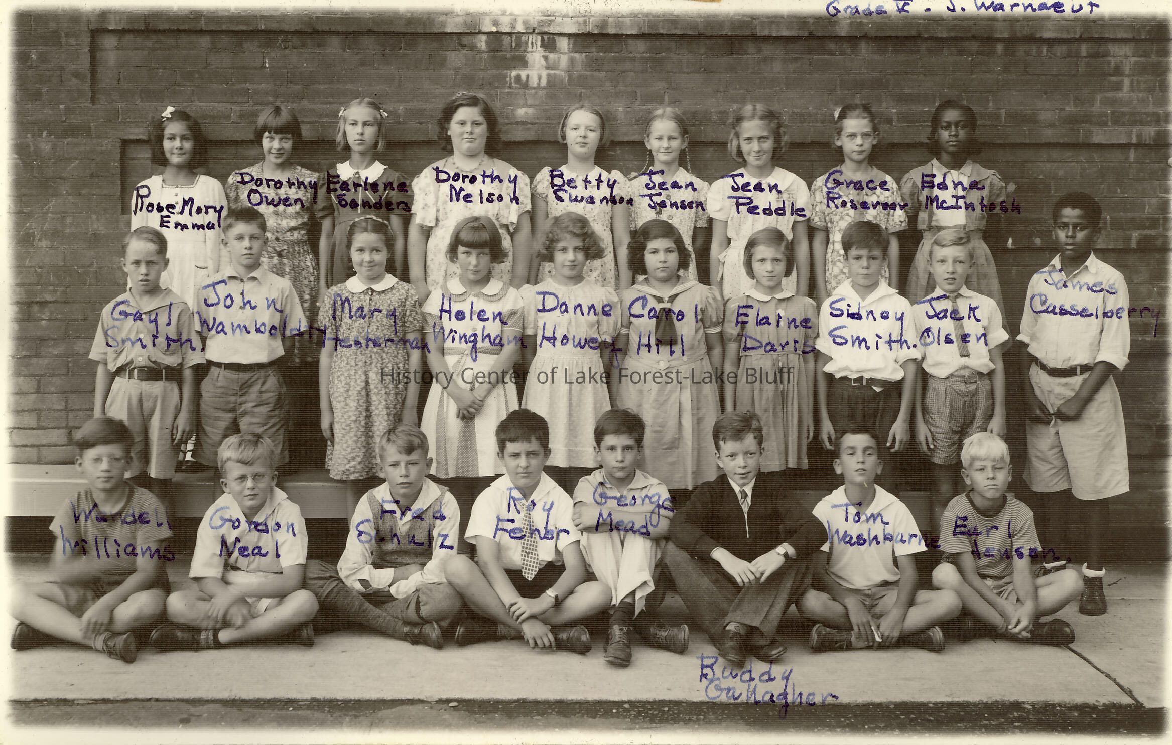 Black and white school class photo. 2 copies, one with names written on front of photo