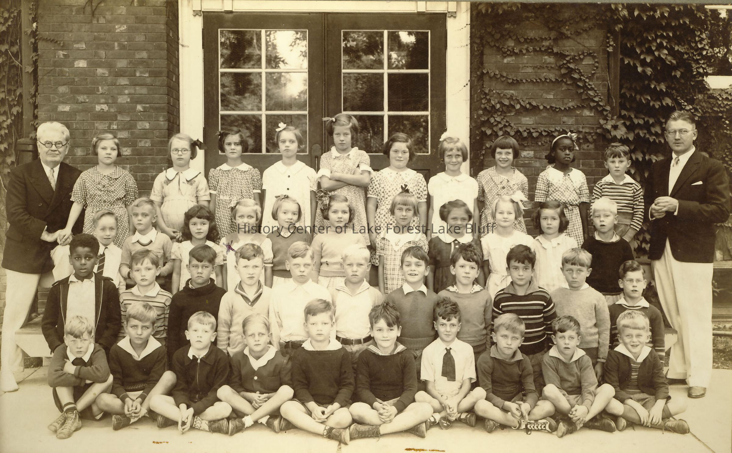 Black and white school class photo, matted Back Row far left - Mr. Baggett written on back: Barb Thorup Johnson