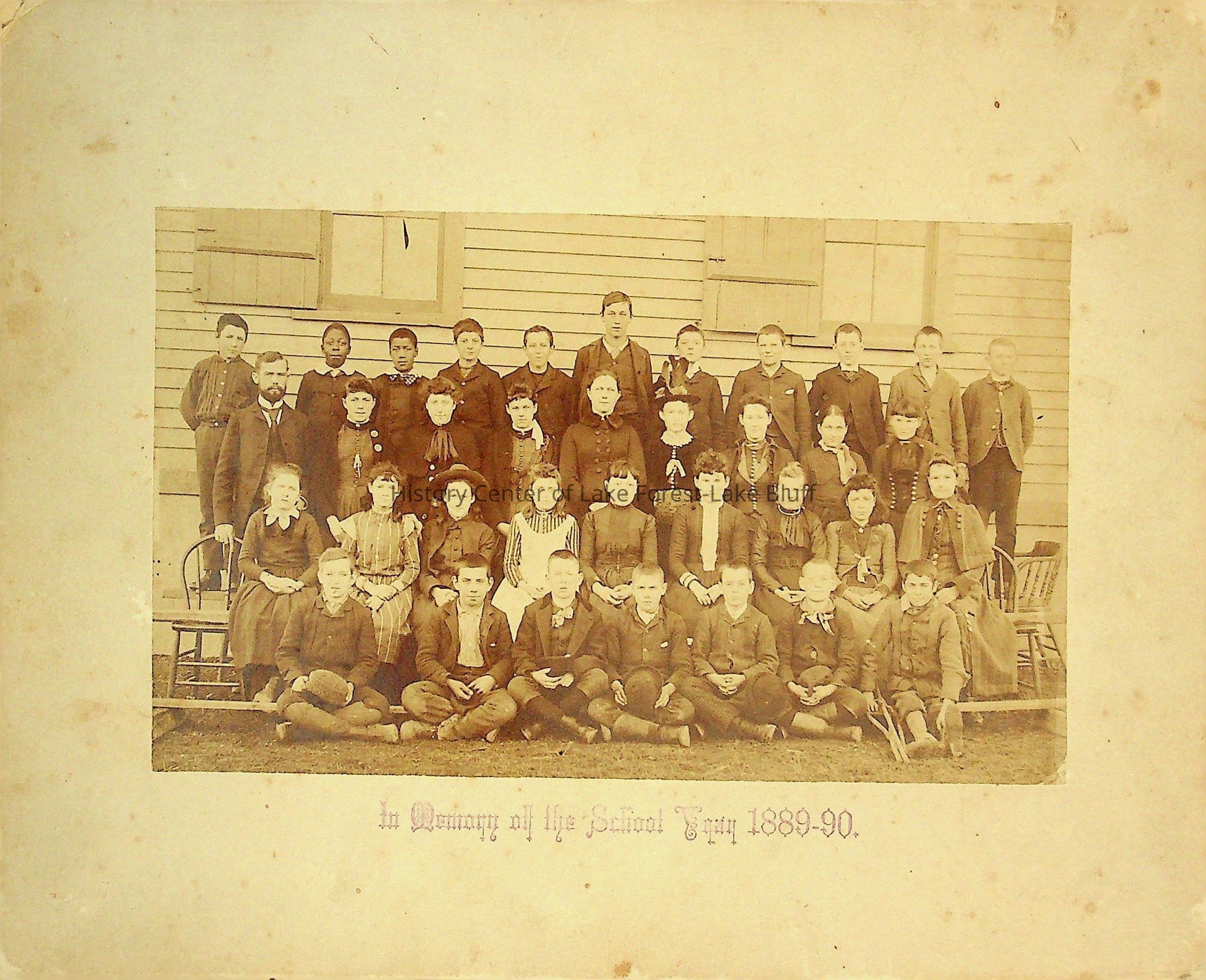 An unlabeled class photo. There is an inscription saying "in memory of the school year 1889-90".