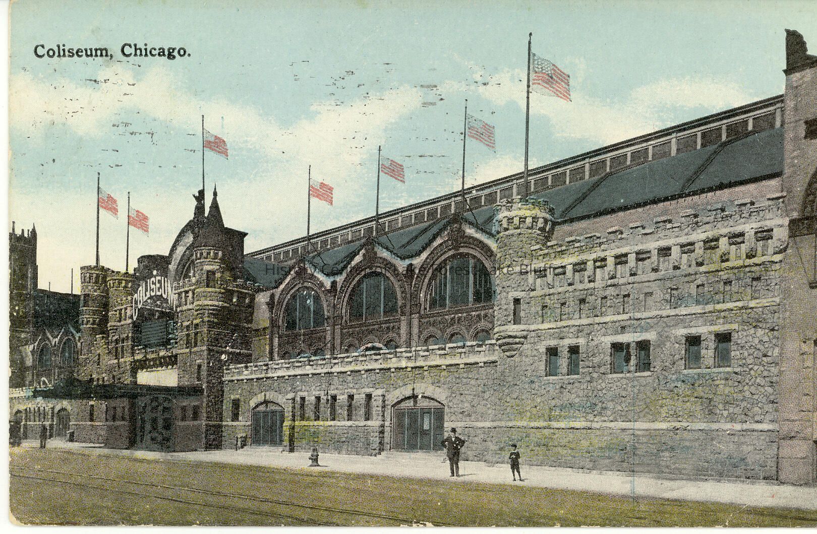 Postcard showing the Coliseum building in Chicago. Reverse includes message addressed to Miss Lillian Low, at the Hubbard Estate in Lake Forest. Stamped dated June 29, 1910 or 1918