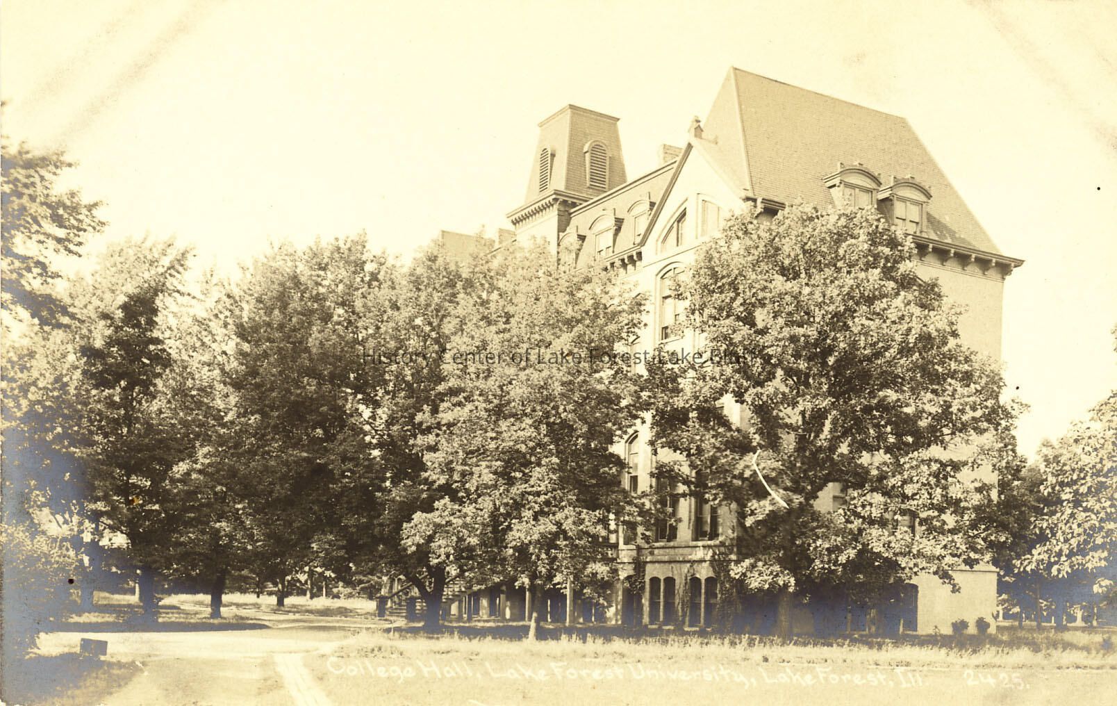 Black and white sepia toned horizontal postcard of College Hall, Lake Forest University (Lake Forest College). Yellow brick Gothic and French structure of five stories. reverse of postcard is blank, address is indicated as 521 N. Sheridan Road