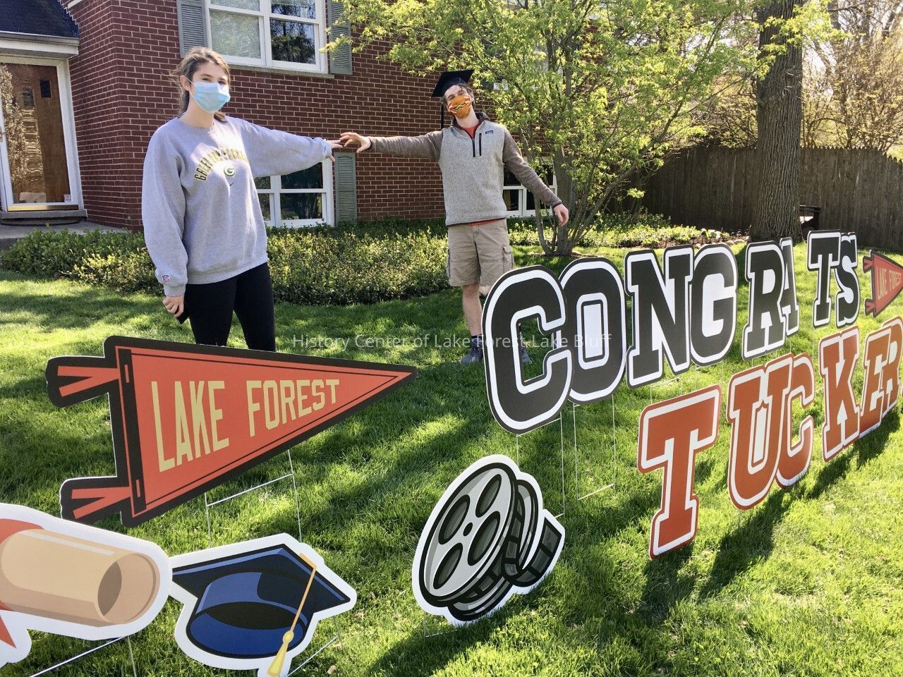 Penny Strang: Tucker Strang ‘20 on graduation day from Lake Forest College with his girl friend Ellie Annibali. “Social distance” trick hand holding photo by Tucker’s celebration sign.Photograph Details