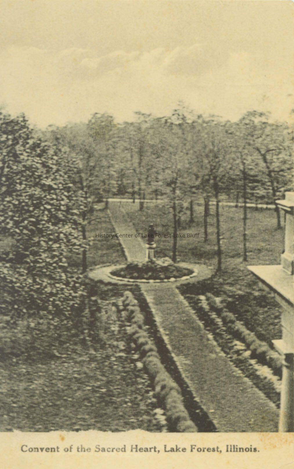 Black and white postcard of the Convent of the Sacred Heart, Lake Forest, Illinois. Made in Germany. Formal garden with a statue. Later called Barat College.Lexicon