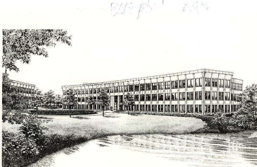 Conway Park office building, Lake Forest. Black and white sketch. designed and developed by Field Partners in the early 1990s