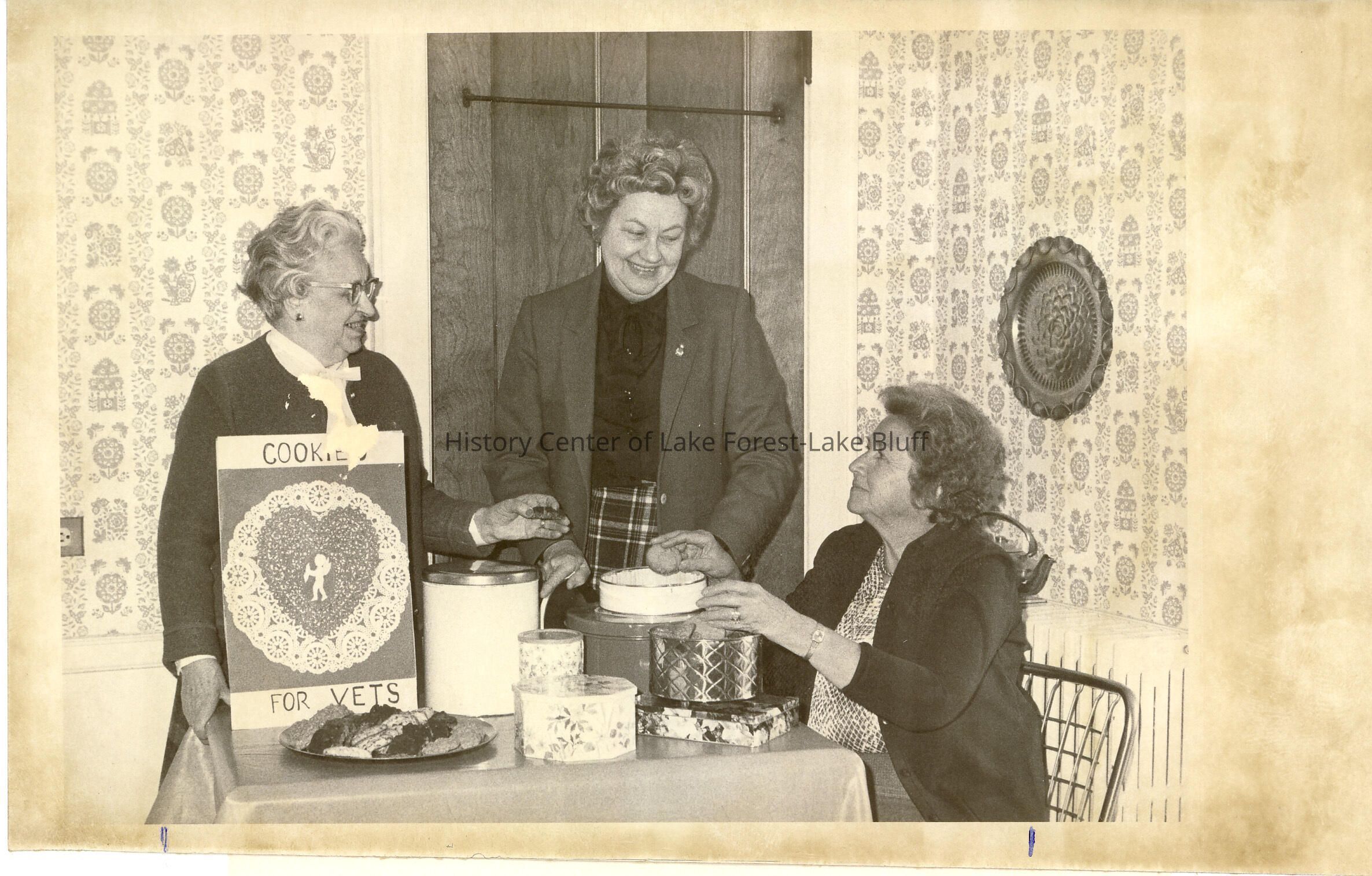 Three women from the Lake Forest Woman's Club posed with cookies on a table and a sign shaped like a heart that reads "Cookies for Vets." The women are Mrs. Ted Cavins, Mrs. Russell Elmer, and Mrs. Vernon Waldorf. Dated 2-10-1983. Possibly a Valentine's Day event.