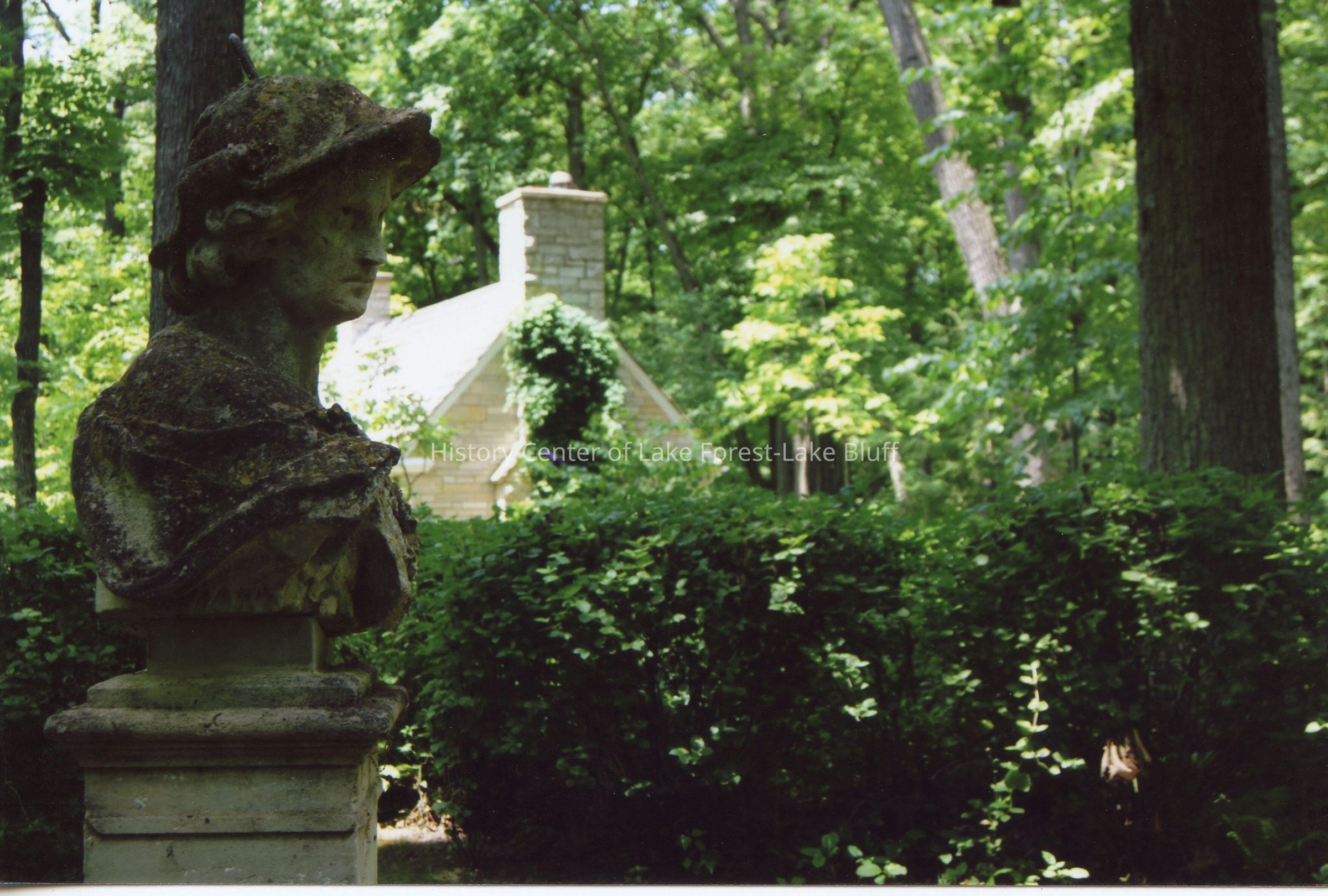 Crab Tree Farm. Designed by David Adler. June 24, 2012. Bust sculpture east of Little House. Color photograph.