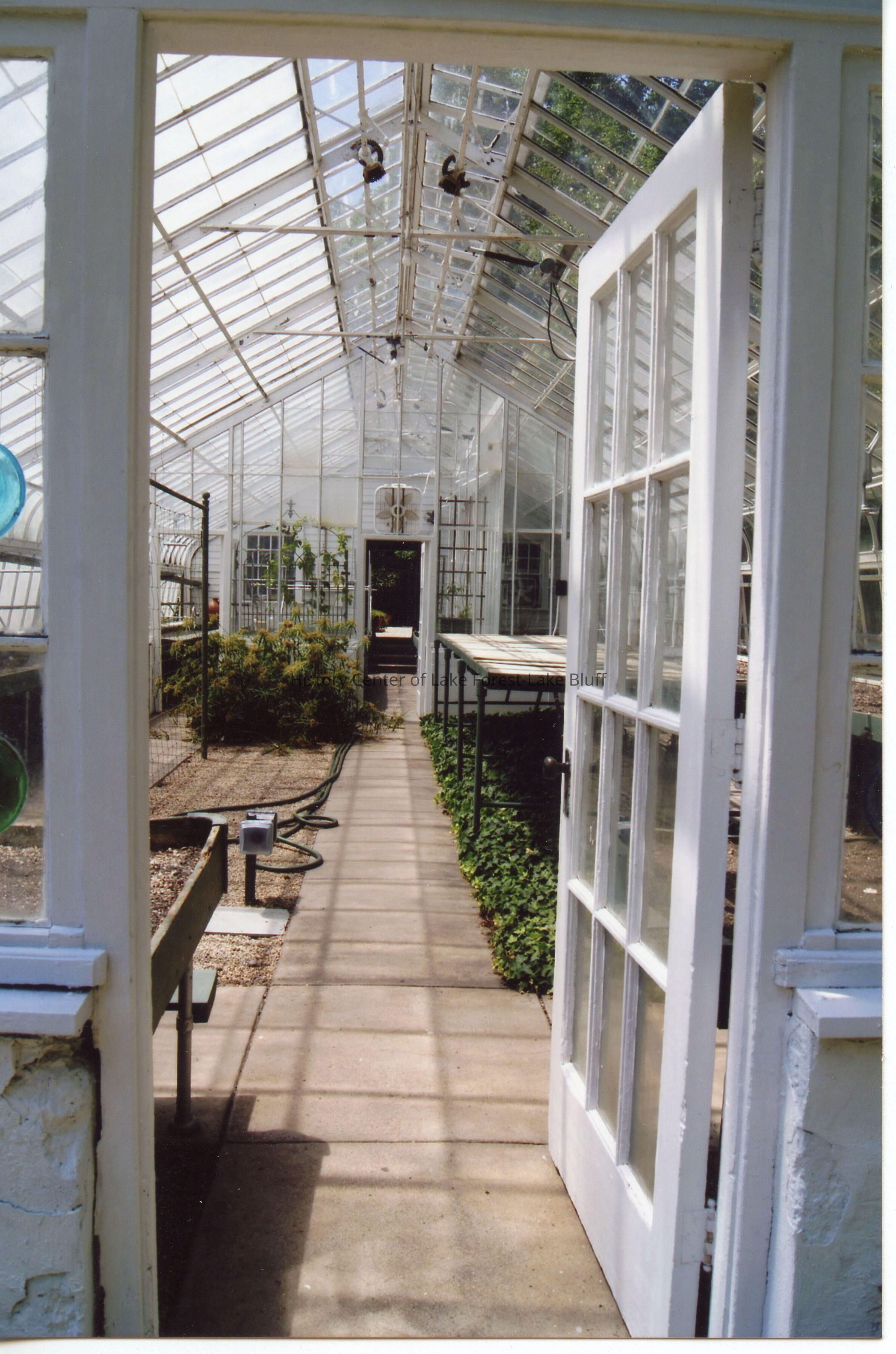 Crab Tree Farm. Designed by David Adler. June 24, 2012. Greenhouse interior looking west. Cutting garden on the left. Cold frames on right.