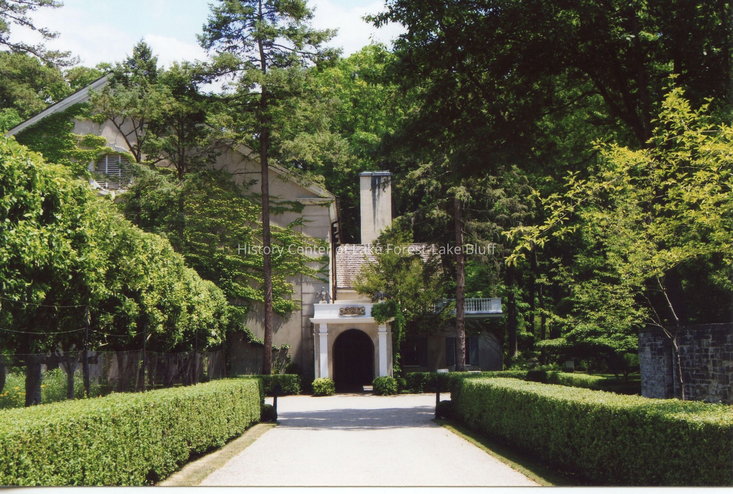 Crab Tree Farm. Designed by David Adler. June 24, 2012. Looking east at the west side of the tennis house. Cutting garden on the left. Color photograph.
