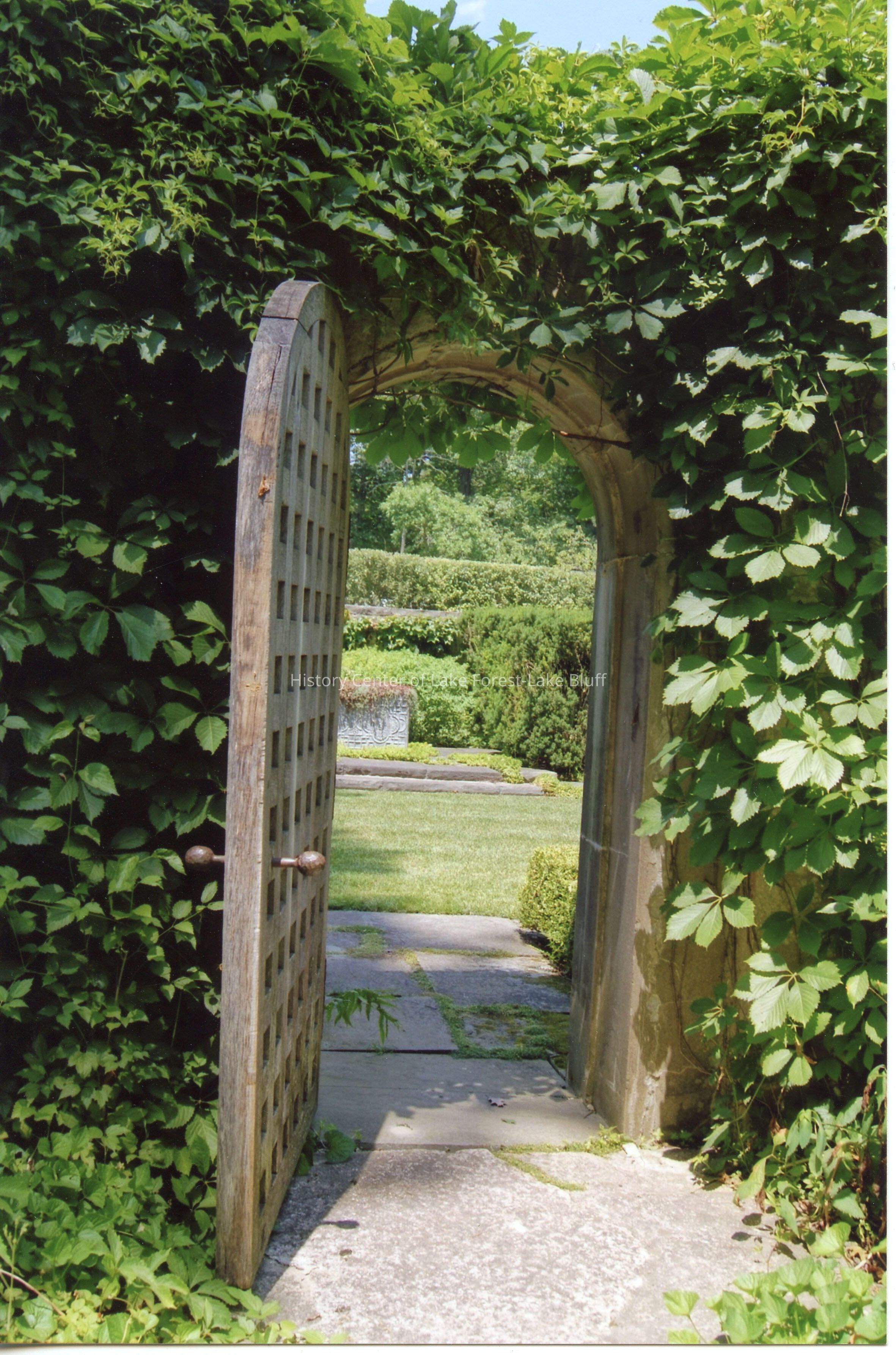 Crab Tree Farm. Designed by David Adler. June 24, 2012. Gate entry to walled garden looking north.