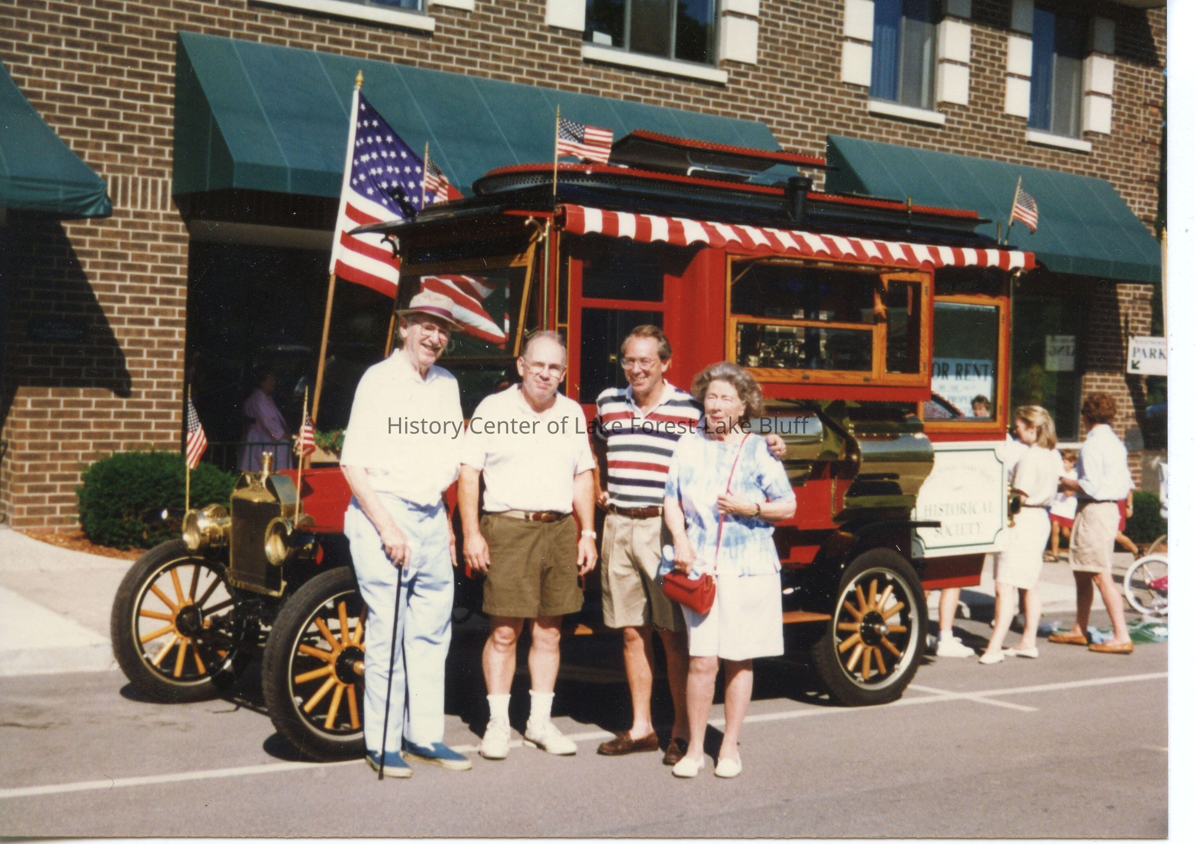 Cretors-Ford Model "T" popcorn truck. Lake Forest-Lake Bluff Historical Society entry in the 1996 Lake Forest Day parade. Identified men and woman are likely Henry and Charlie Cretors and C.J. and Georgia Cretors.