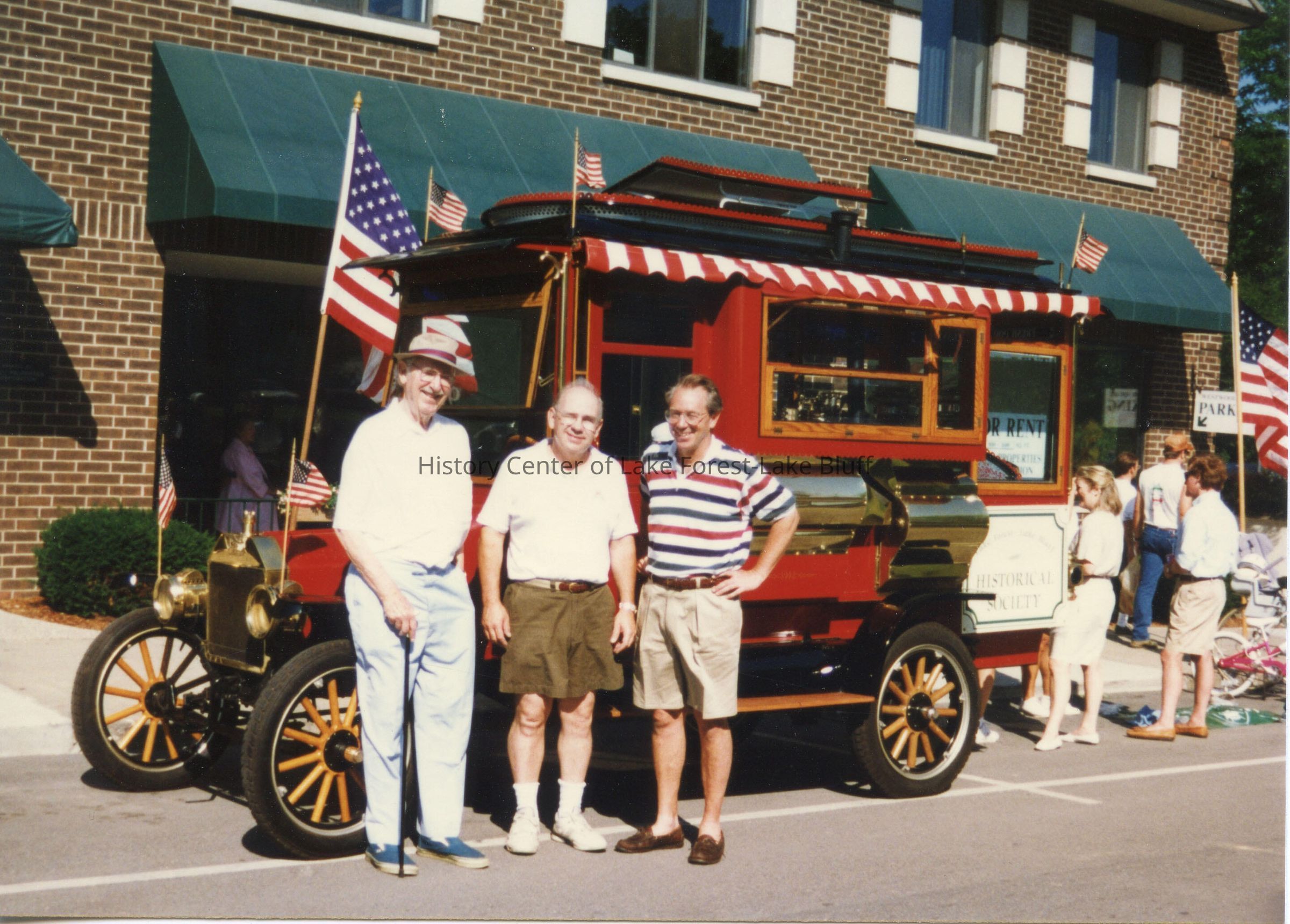 Cretors-Ford Model "T" popcorn truck. Lake Forest-Lake Bluff Historical Society entry in the 1996 Lake Forest Day parade. Identified men are likely Henry, Charlie, and C.J. Cretors