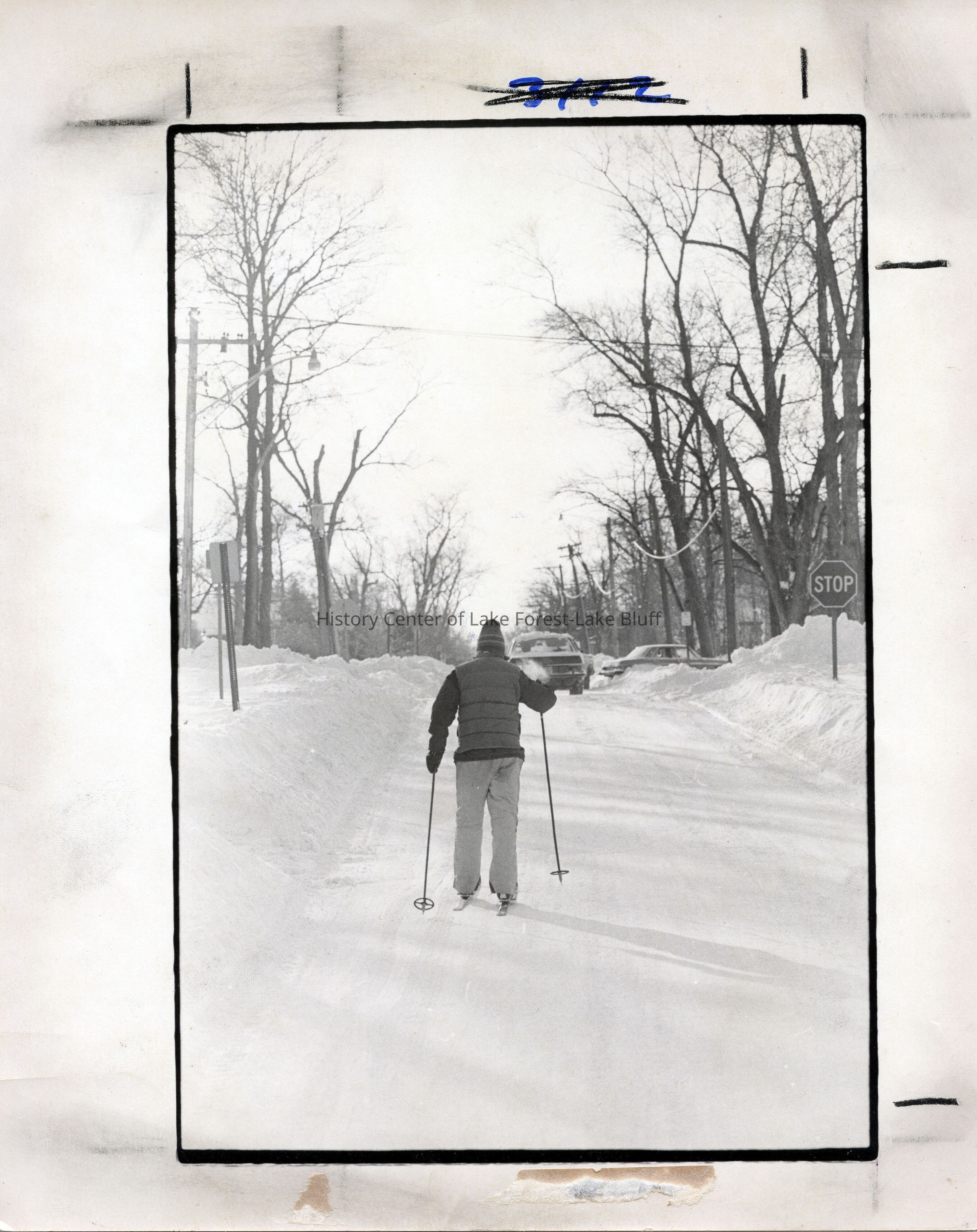 Unidentified cross country skier going up a snow-covered road in winter in Lake Forest. Says "LF 1-25" on the back - January 25? No year.