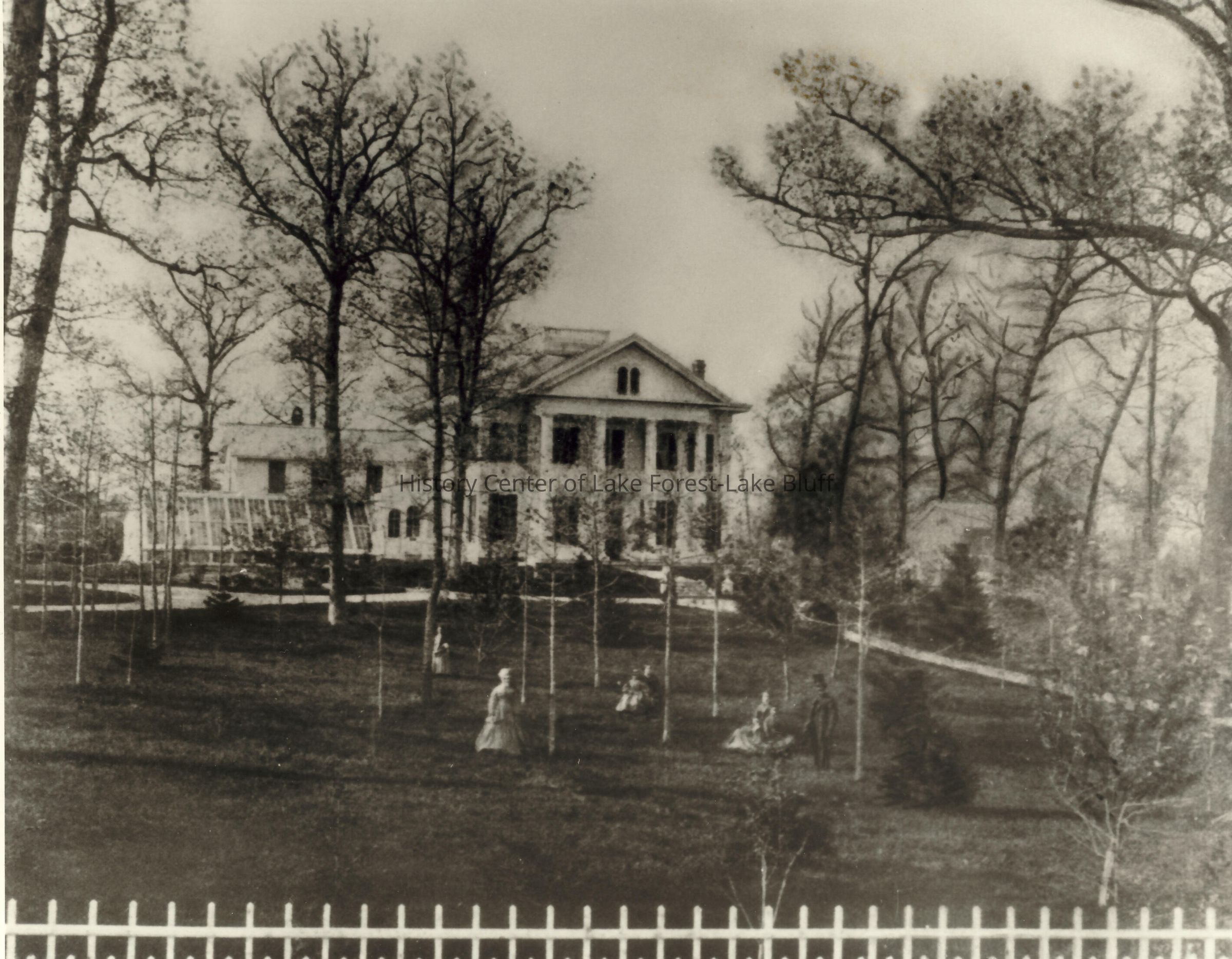Black and white reprint and enlargement of the original Quinlan home at 404 Deerpath. In foreground light picket fence. On lawn five women, a child and a man pose between the trees. Three story house and greenhouse in the background.