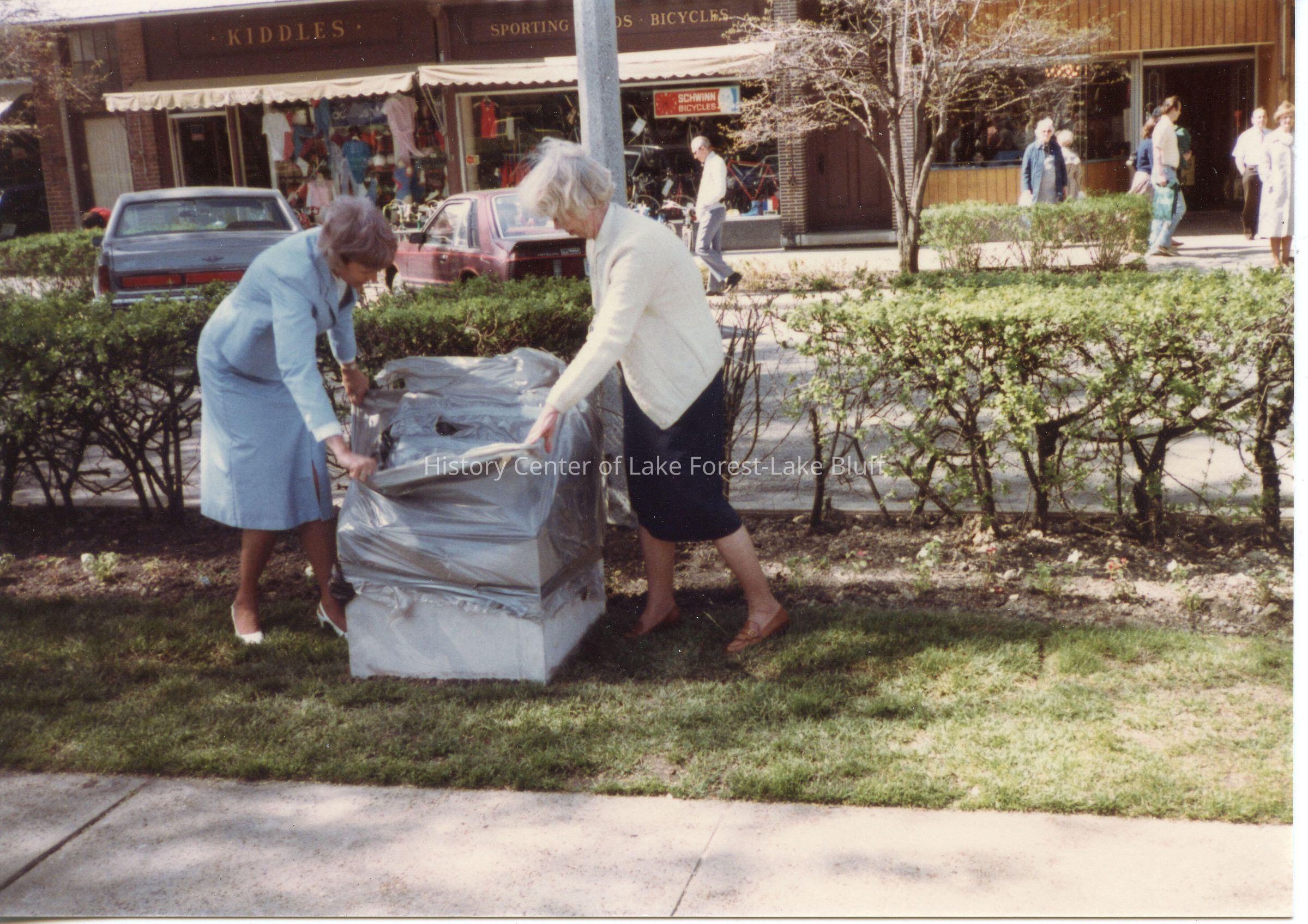 Color photograph of Daughters of the American Revolution dedication of bronze marker in Market Square May 12, 1984. Shows two women revealing the marker. See Lake Forester, 5-10-1984.