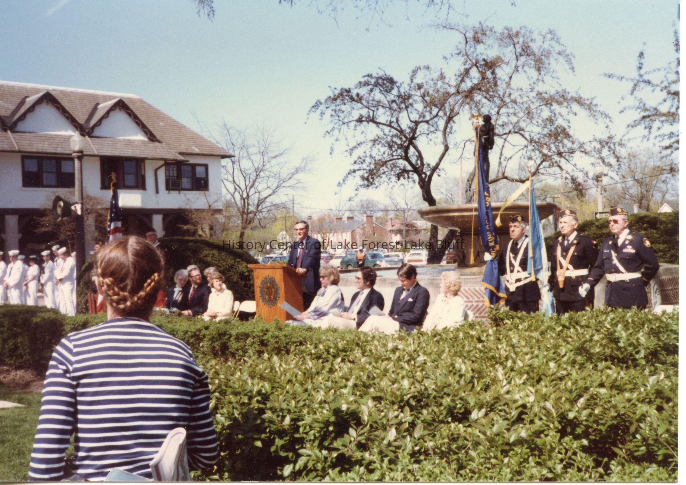 Color photograph of Daughters of the American Revolution dedication of bronze marker in Market Square May 12, 1984. Mayor Francis C. Farwell at the podium. Susan Dart seated to left of podium. Mary Lee Birmingham seated to right of podium. See Lake Forester, 5-10-1984.