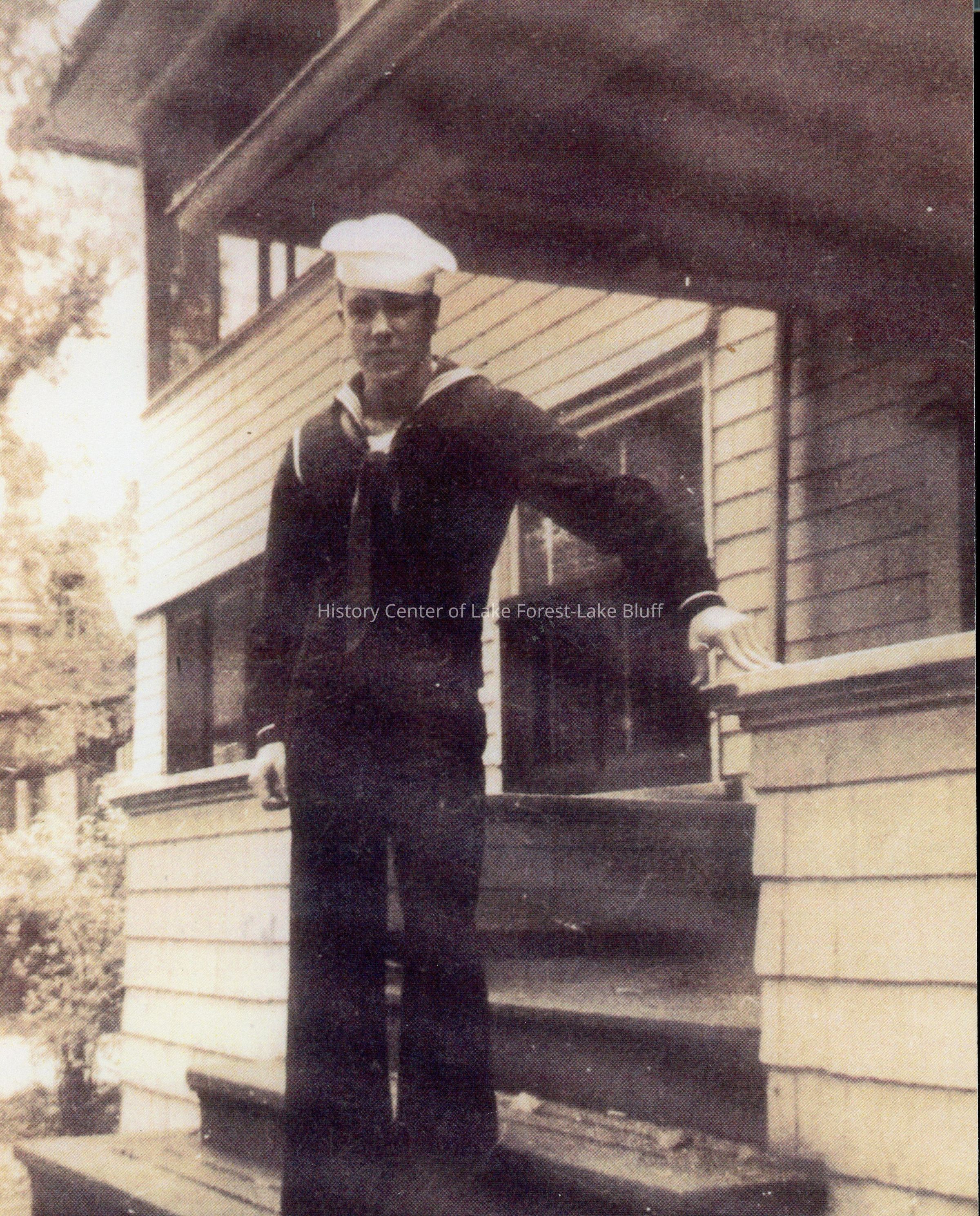 A man in navy uniform poses on a porch.